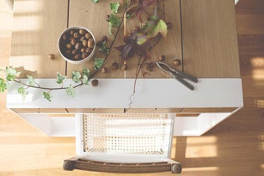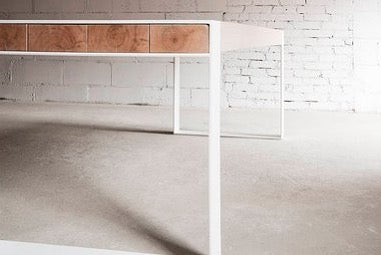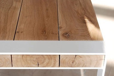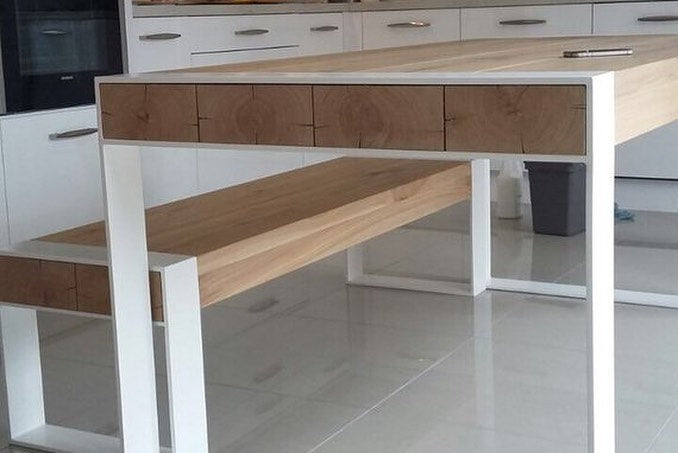 Oak wood straight Edge Mid-century white Metal work Dining Table & Bench