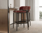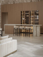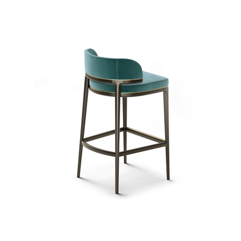 The Grange bar stool has a refined silhouette with a strong legs structure supporting the seat. The brass elements outlining the upholstery bring to the design a sophisticated look, exalting the luxury craftsmanship.