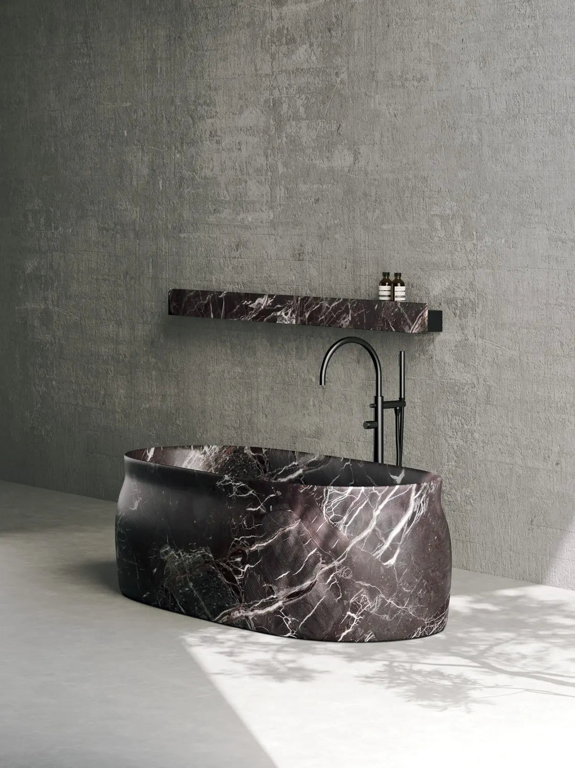 Set against a minimalist concrete or natural stone backdrop, the Eclipse Noir creates a spa-like ambiance, perfect for unwinding in sheer indulgence. The integrated shelf in matching marble complements the design, offering a functional yet stylish space for bath essentials.