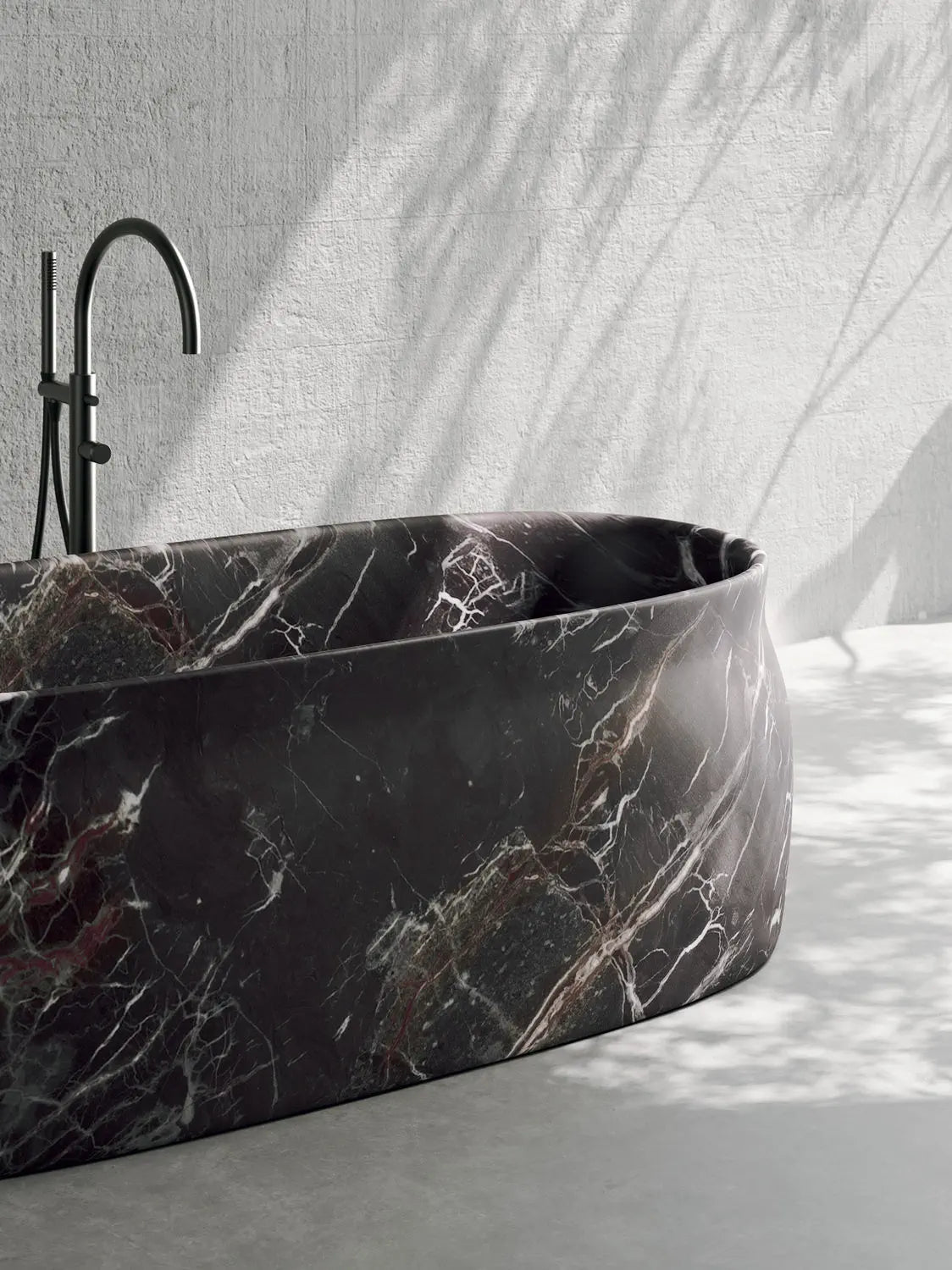 Experience the epitome of luxury with the Eclipse Noir Freestanding Marble Bathtub, a stunning centerpiece that seamlessly blends sophistication and functionality. Carved from a single block of premium black marble with intricate white veining, this bathtub embodies timeless elegance and modern minimalism.