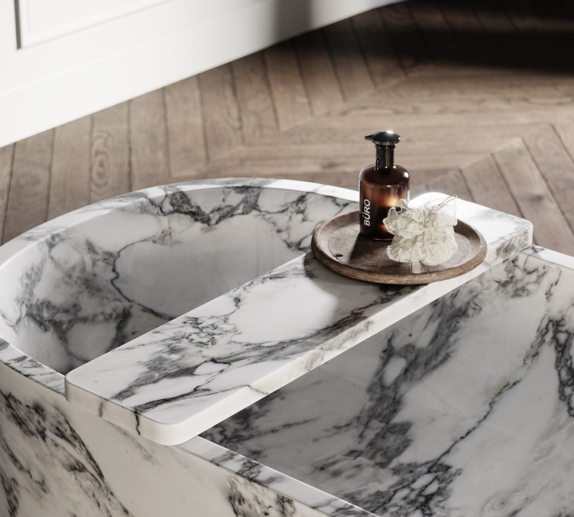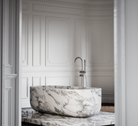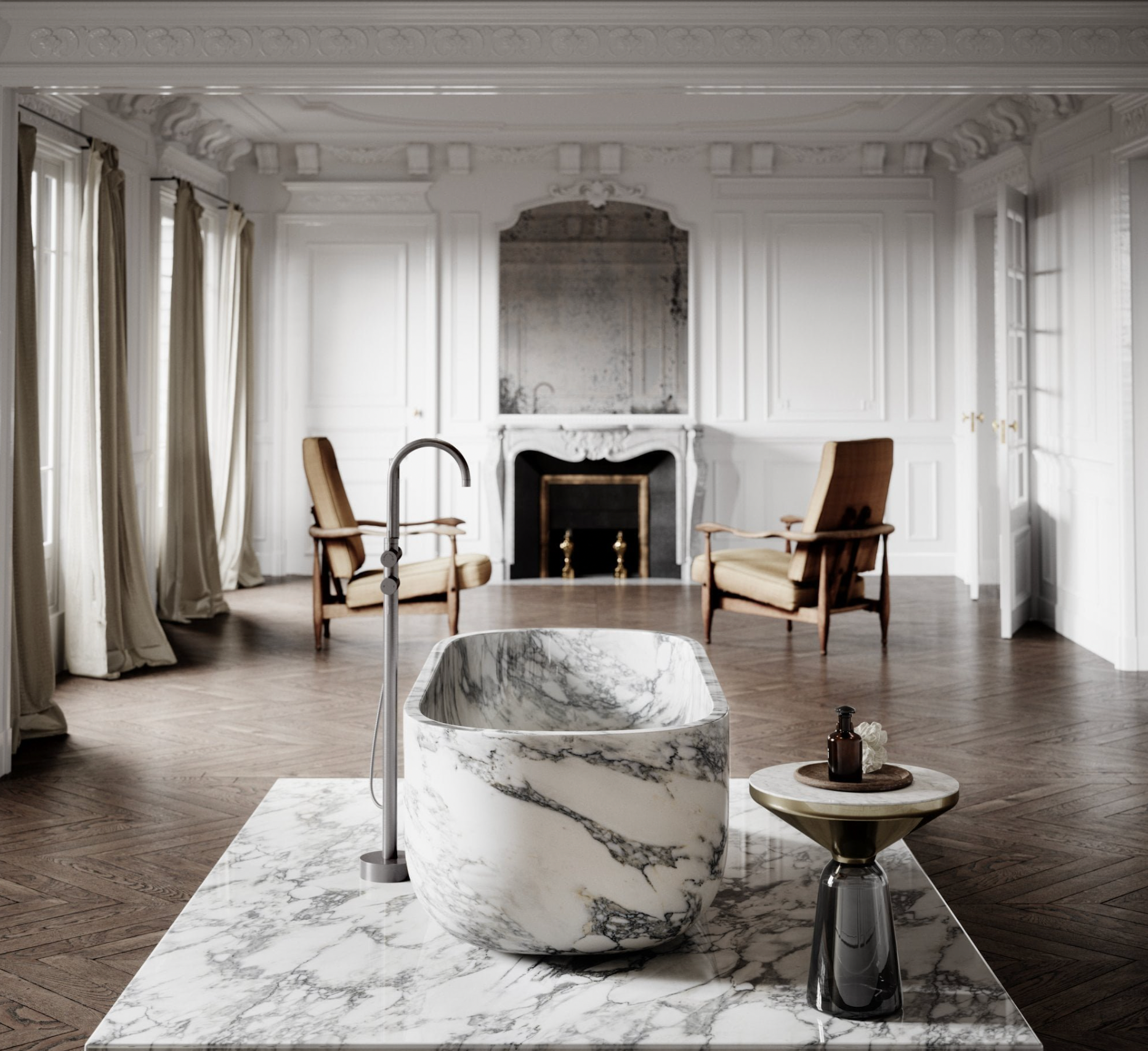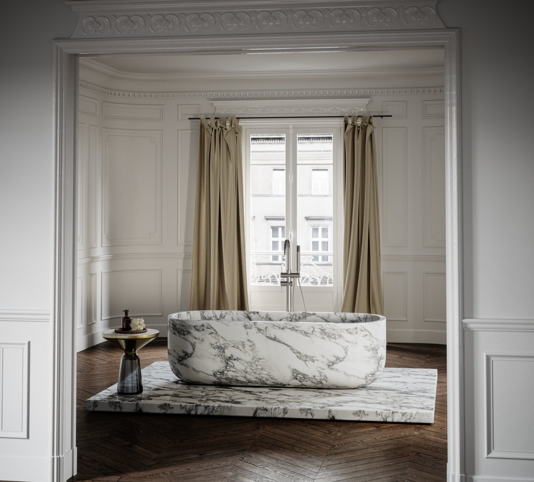 Designed with a sculptural oval silhouette, its smooth curves and softly rounded edges create a sense of effortless refinement. The natural veining of the Calacatta marble enhances its visual depth, while the polished surface exudes a luminous glow, seamlessly blending into high-end interiors. Whether placed in a modern spa retreat or a classic Parisian-style bathroom, this bathtub transforms any space into a sanctuary of relaxation.