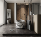 Elevate your bathing experience with the Elysium Calacatta Freestanding Marble Bathtub, a luxurious statement of elegance and timeless sophistication. Meticulously carved from exquisite Calacatta marble, this bathtub showcases stunning white stone with bold, dramatic gray veining, making each piece uniquely beautiful.