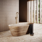The Empire Oval ravertine Natural Stone Bathtub offers a stunning fusion of modern design and the natural beauty of stone. This sleek and sophisticated bathtub, crafted from premium travertine, is a perfect example of contemporary luxury. Its smooth, oval shape provides a minimalist yet elegant aesthetic, while the unique texture and natural veining of the travertine enhance its organic appeal, giving the bathtub a refined and timeless quality.