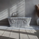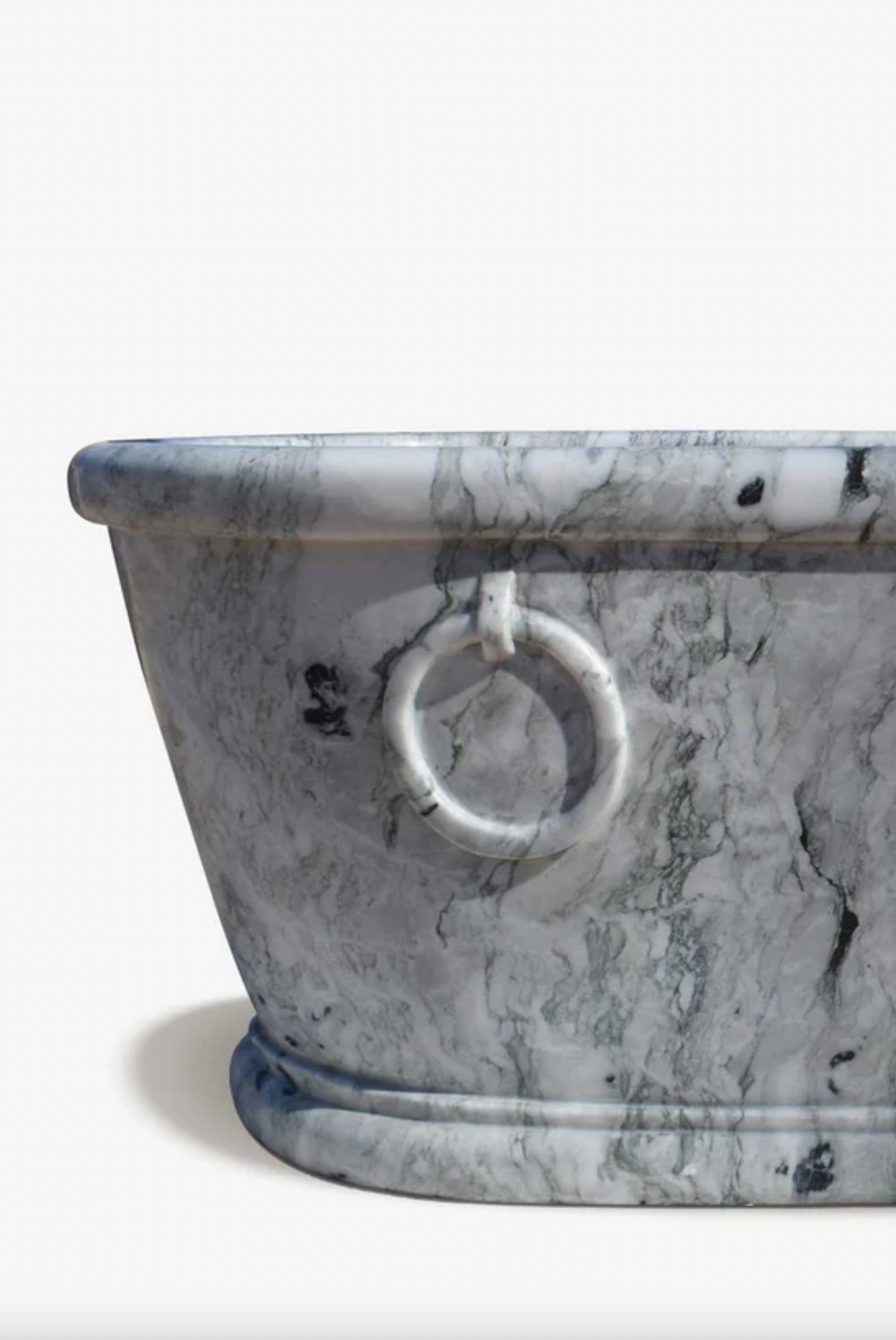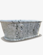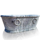 With a tapered silhouette that gracefully widens toward the top, the Imperium Calacatta blends timeless elegance with modern-day comfort. The rounded rim detailing enhances its visual depth, while the ornate sculpted ring embellishments on either side add a touch of Old-World charm. The polished surface reflects light beautifully, emphasizing the natural variations in the stone, making each piece unique.
