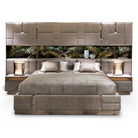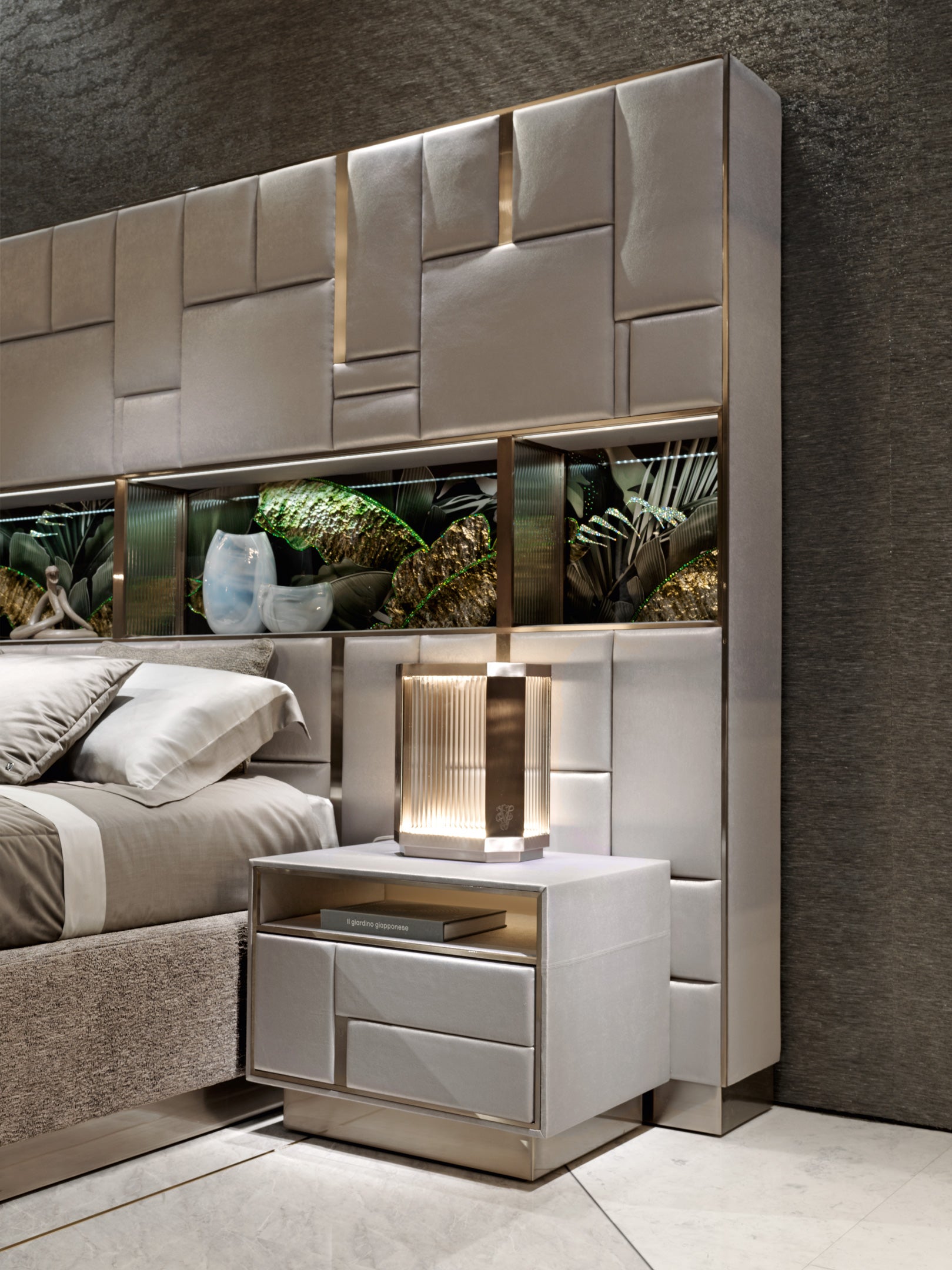 Bed upholstered in leather or fabric. Headboard padded as to design a geometric pattern; structure in plywood panels and solid wood with slightly padded tiles, upholstered one by one. Plinth and decorative elements inserted into bed base and headboard in stainless steel with satin finish. Storage compartment with back panel decorated with artistic artwork by Michele Astolfi made in printed polycarbonate and decorated with inserts in artistic glass and Swarovski crystals. LED courtesy lights. Headboard provided disassembled and designed to be installed on the wall. Bed base in plywood padded with polyurethane foam, consisting of several elements upholstered one by one and decorated with inserts and base in satin stainless steel. Predisposed for wooden slats, supported by four corner braces and one central rod in lacquered steel, adjustable in height. Decorative metal elements can be finished with any lacquer of the metal lacquer finish selection.