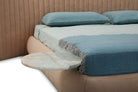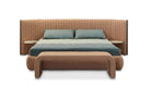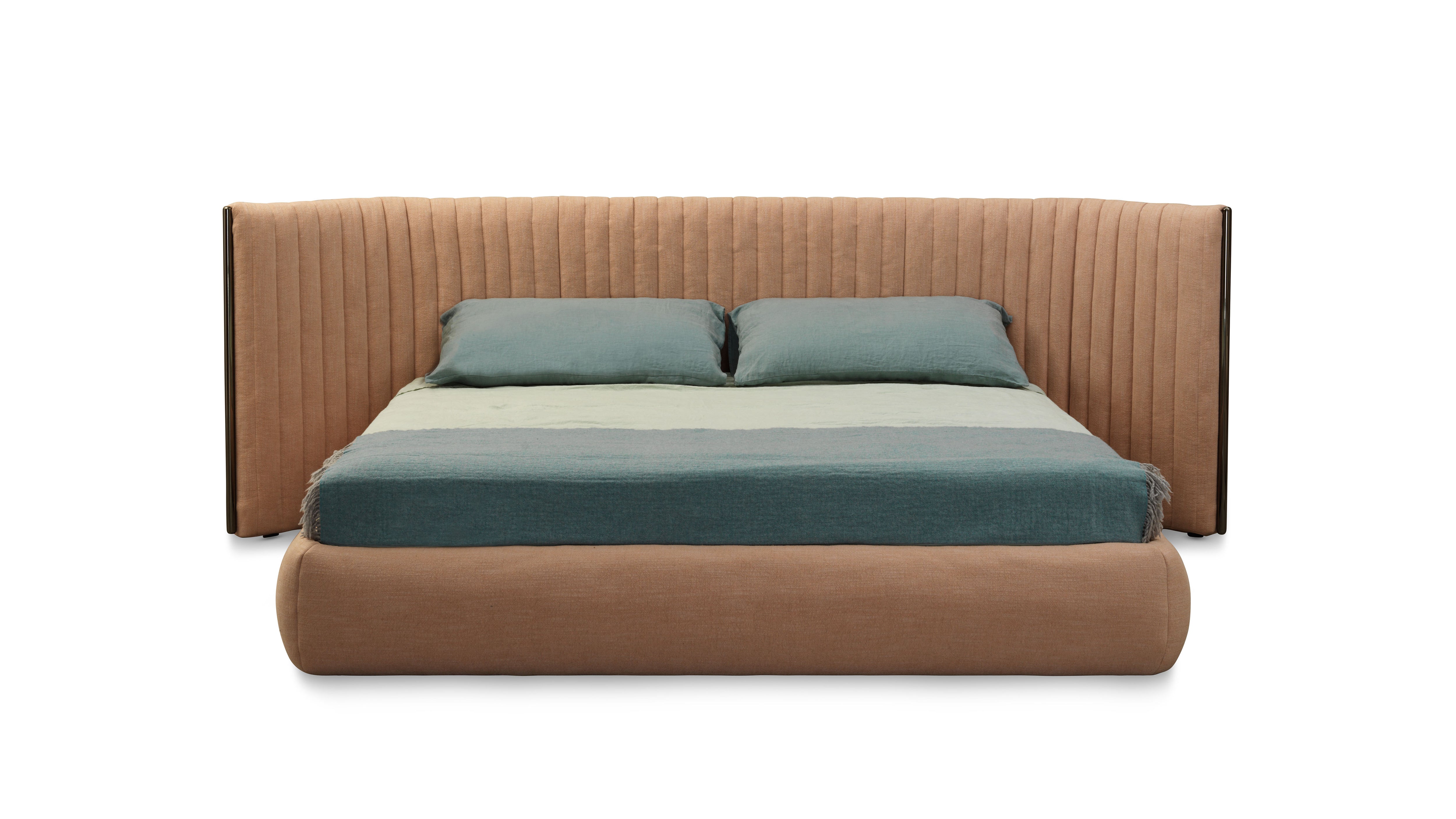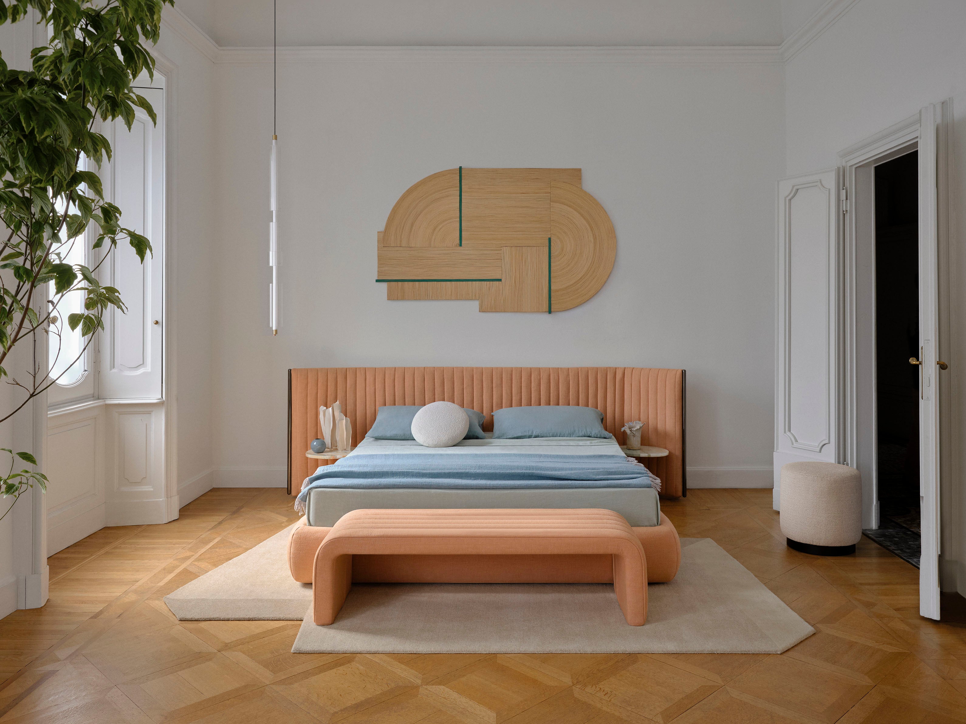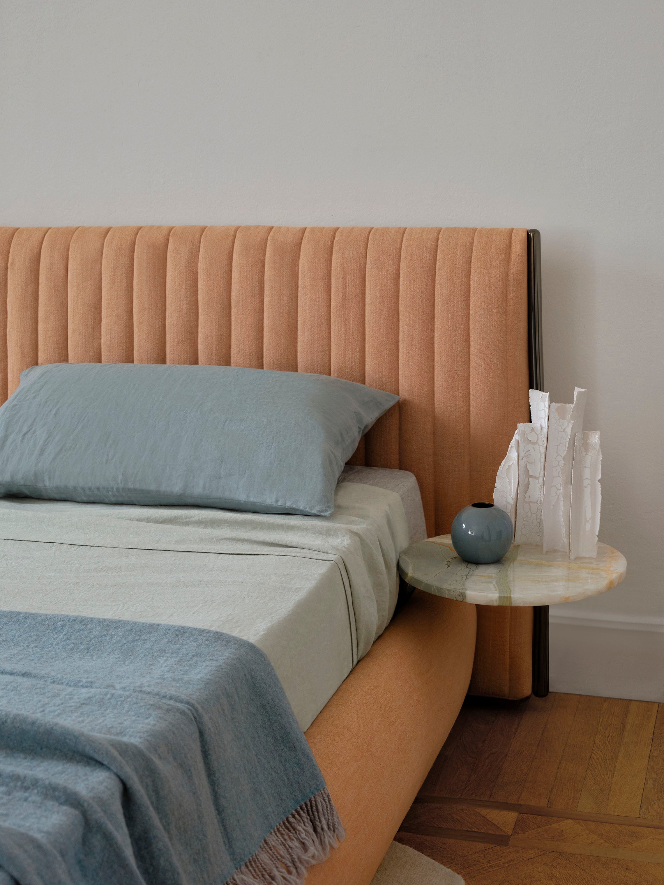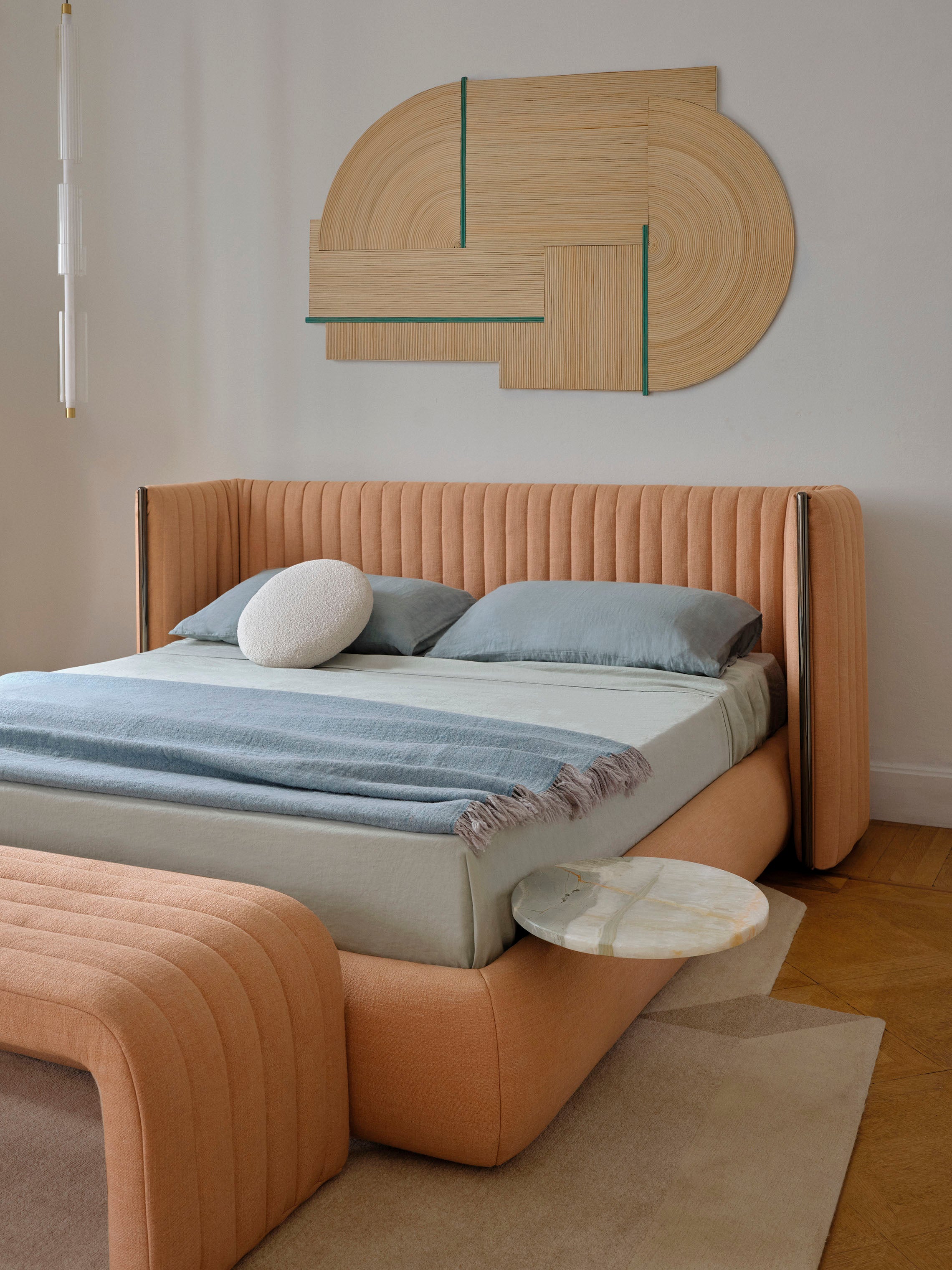 The Metis bed reimagines the classic aesthetic with a modern approach to flexibility. Its quilted headboard transforms with a simple movement, shifting from an open and graphic layout to a geometric, airy form, or to a more intimate, enclosed shape. Each configuration creates a distinct visual presence while maintaining timeless elegance. The bed also features refined support surfaces in fine onyx that function as bedside tables, which can be repositioned along the perimeter to adapt to different needs.