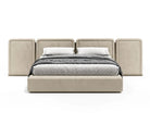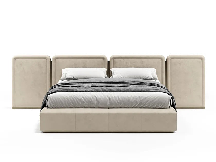 The Orion bed embodies modern Italian luxury with its extra-large design, upholstered in sumptuous ivory fabric and accented with gold-finish metal details. Its structure combines a sturdy wooden frame with foam padding and a sleek metal base, while the extended headboard features refined metal accents.