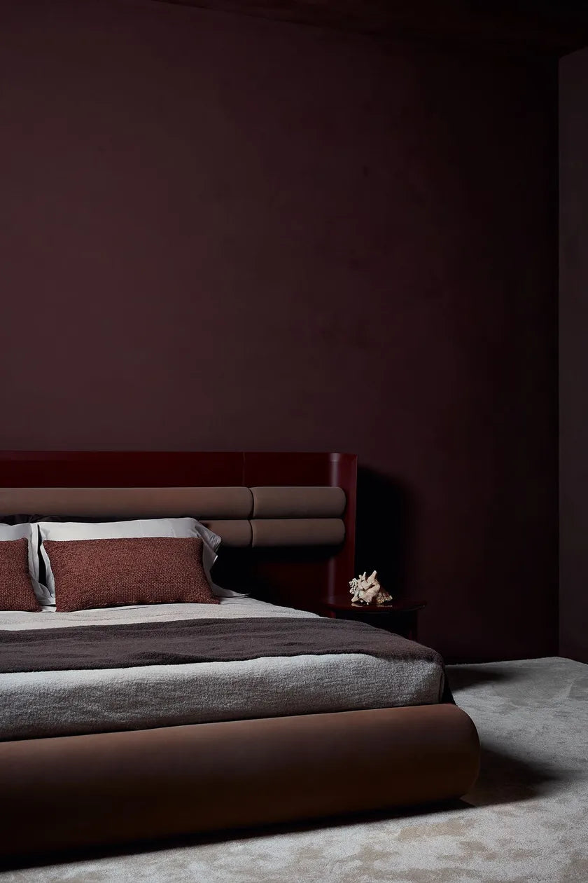 The Sunrise bed combines comfort and durability with a structure in non-deformable foam polyurethane of varying densities and polyester fiber. Its curved freestanding headboard is available in black open-pore stained wood with a foam headrest, or in an opaque lacquered wooden finish in colors including Rosso Persia, Grigio Londra, Nero Giza, Bianco Camargue, Verde Provenza, Blu Pacifico, Bordeaux Etruria, Rosa Jaipur, and Sabbia del Nilo.