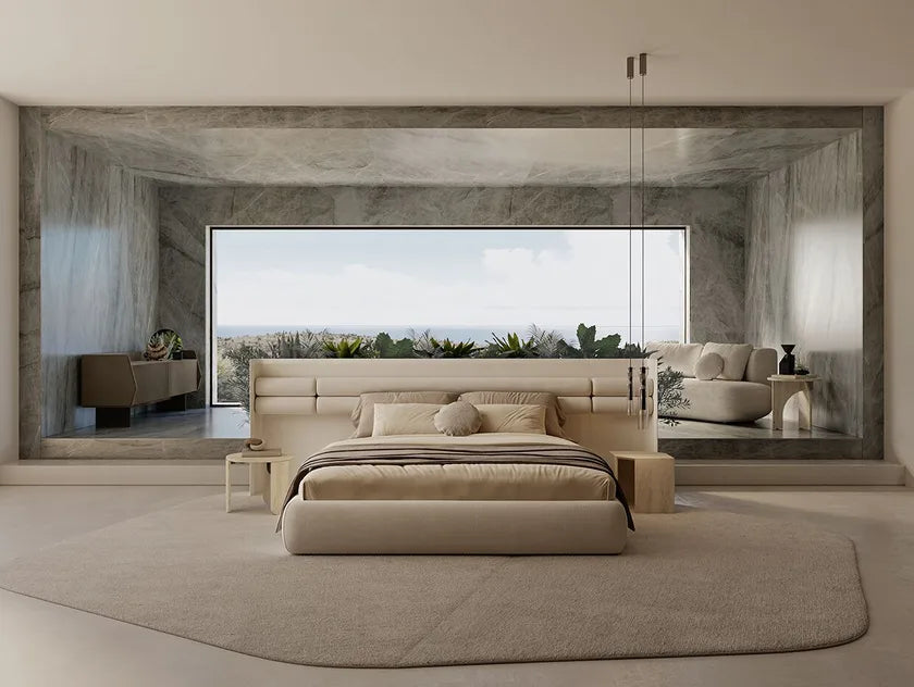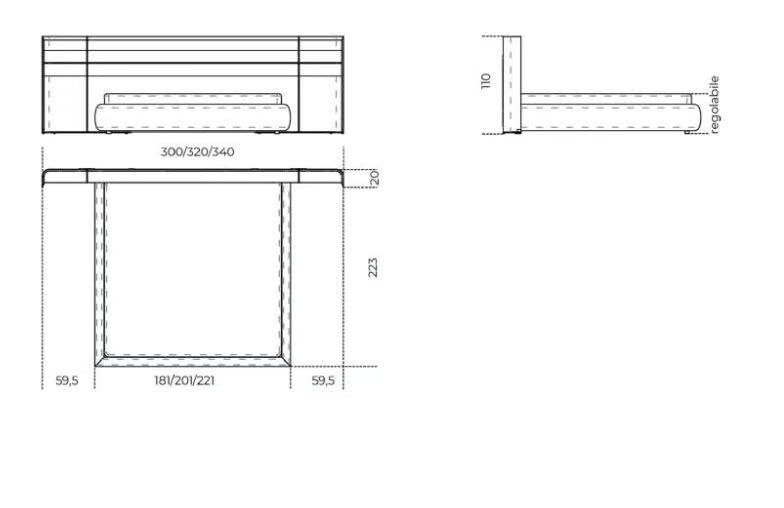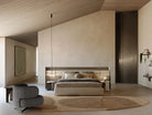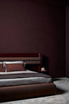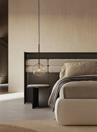 The bed can also be upholstered in fabric or leather according to samples, with black nickel-plated metal details and included wooden slats. Both the bed frame and headrest (excluding Cat. L1, L2, and customer leather C.O.L.) are removable. Leather-upholstered elements require additional stitching compared to fabric versions, ensuring refined craftsmanship and lasting quality.