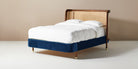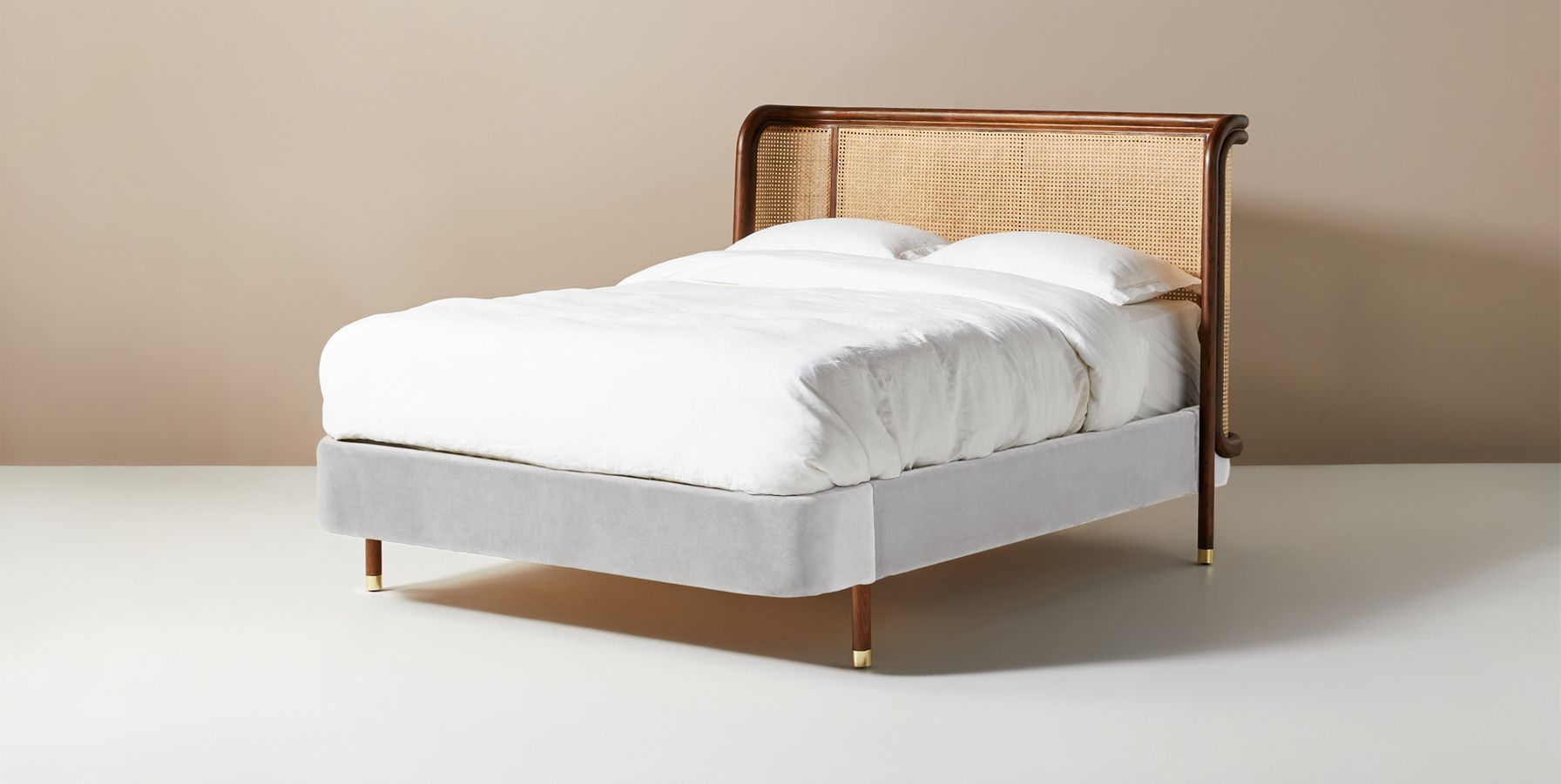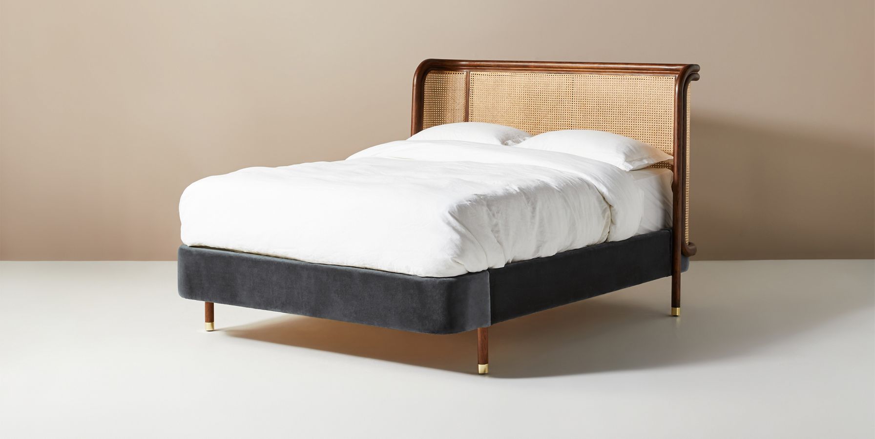 Bring the outdoors in with this light and airy piece - its elegantly curved caning headboard and velvet upholstered frame are well-suited for a contemporary bedroom.