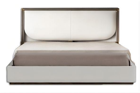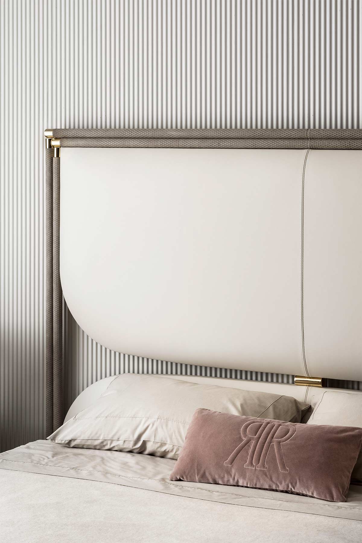 Headboard upholstered in smooth or printed leather with a metal frame finished in bronze or gloss brass. Upholstered bed-frame.