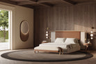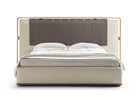 Rigorous lines and contemporary design are the hallmarks of the Lario bed, design by Andrea Bonini, thanks to its search for timeless elegance and meticulous attention to details. Lario bed features a high headboard with an external wooden frame, which encloses a padded panel covered in fabric or leather. The panel is supported by golden metal details and seems hanging like a painting in the background. In the Quilt version, the insert on the headboard is quilted vertically. The sturdy and solid bed frame, enriched by an elegant base covered in leather, offers a sophisticated visual contrast to the aerial headboard, for a glamorous approach of aesthetic purity. The mixture of different materials and textures makes the Lario bed the undisputed protagonist of the night area. The decorative cushions provide an additional textile addition, for a refined detail.