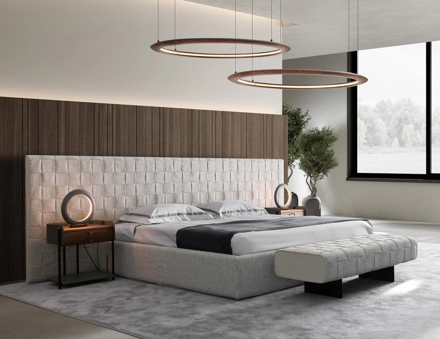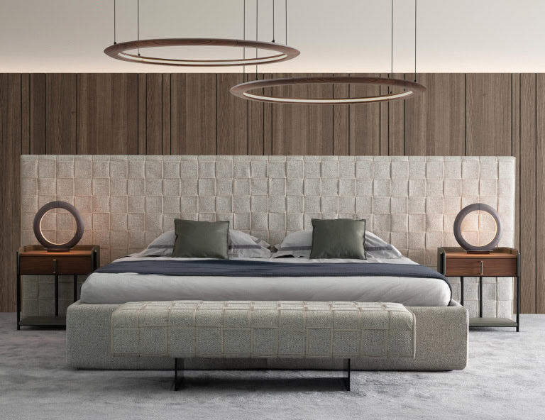 Customizable options include premium leather or a variety of woven fabrics, allowing combinations such as braided fabric with leather piping or leather with fabric piping for a personalized design. Versatile and refined, the Vinnie bed enhances any bedroom with its luxurious aesthetic.
