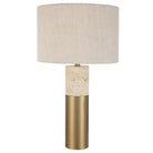 The Gravitas Table Lamp Lives Up To Its Name With Its Sophisticated Finishes And Design. The Iron Column Base Is Finished In An Elegant Plated Brushed Brass With A Porous Ivory Stone Top. The Lamp Is Paired With A Casual Light Beige Linen Shade With Subtle Texture.The Gravitas Table Lamp Lives Up To Its Name With Its Sophisticated Finishes And Design. The Iron Column Base Is Finished In An Elegant Plated Brushed Brass With A Porous Ivory Stone Top.