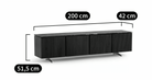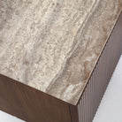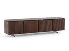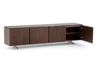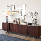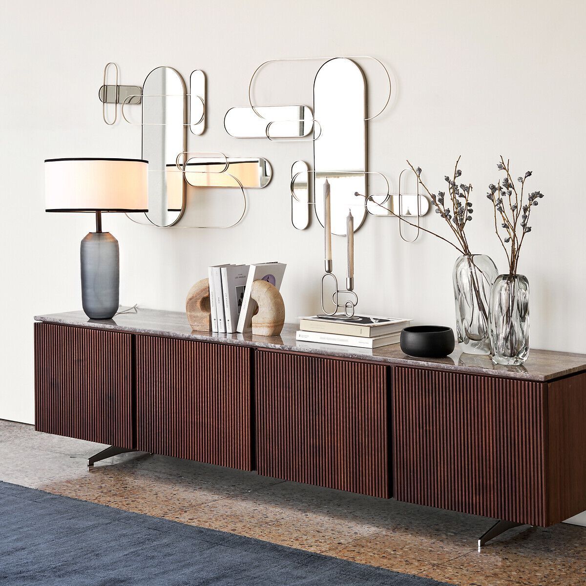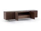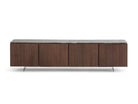 A TV cabinet with clean lines and refined finishes.‎ Jakto plays on contrasts, with a bevelled travertine top, solid walnut FSC® fronts with a grooved effect, and an overhead sled base in satin nickel.‎ Four slow-closing doors conceal a large drawer and a fixed shelf in the centre, and two adjustable shelves at the ends.‎ This 2 m long sideboard, as functional as it is aesthetic