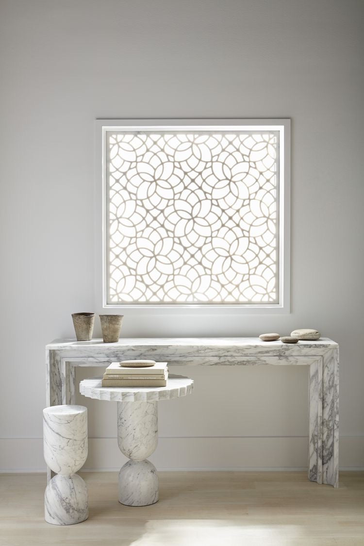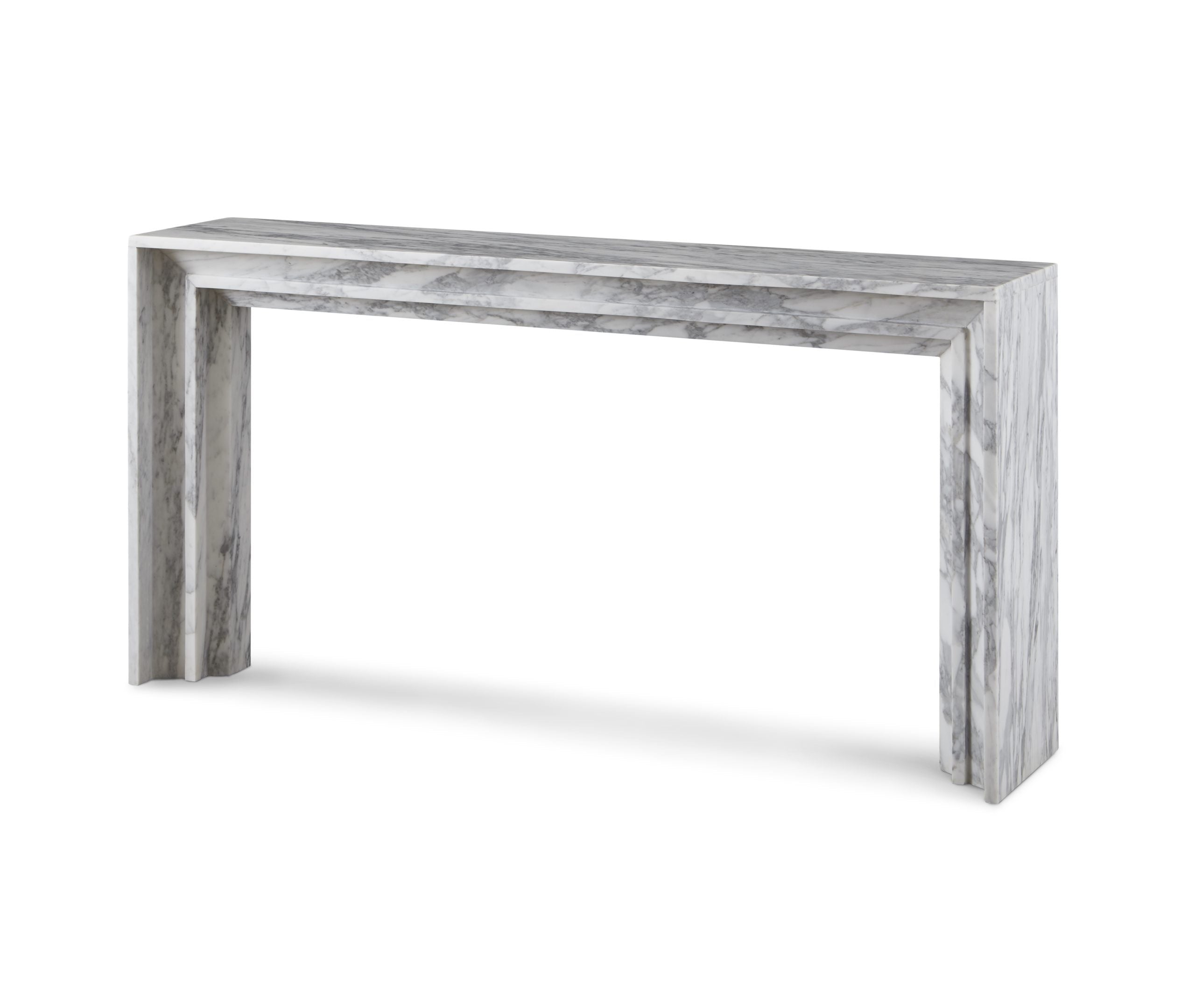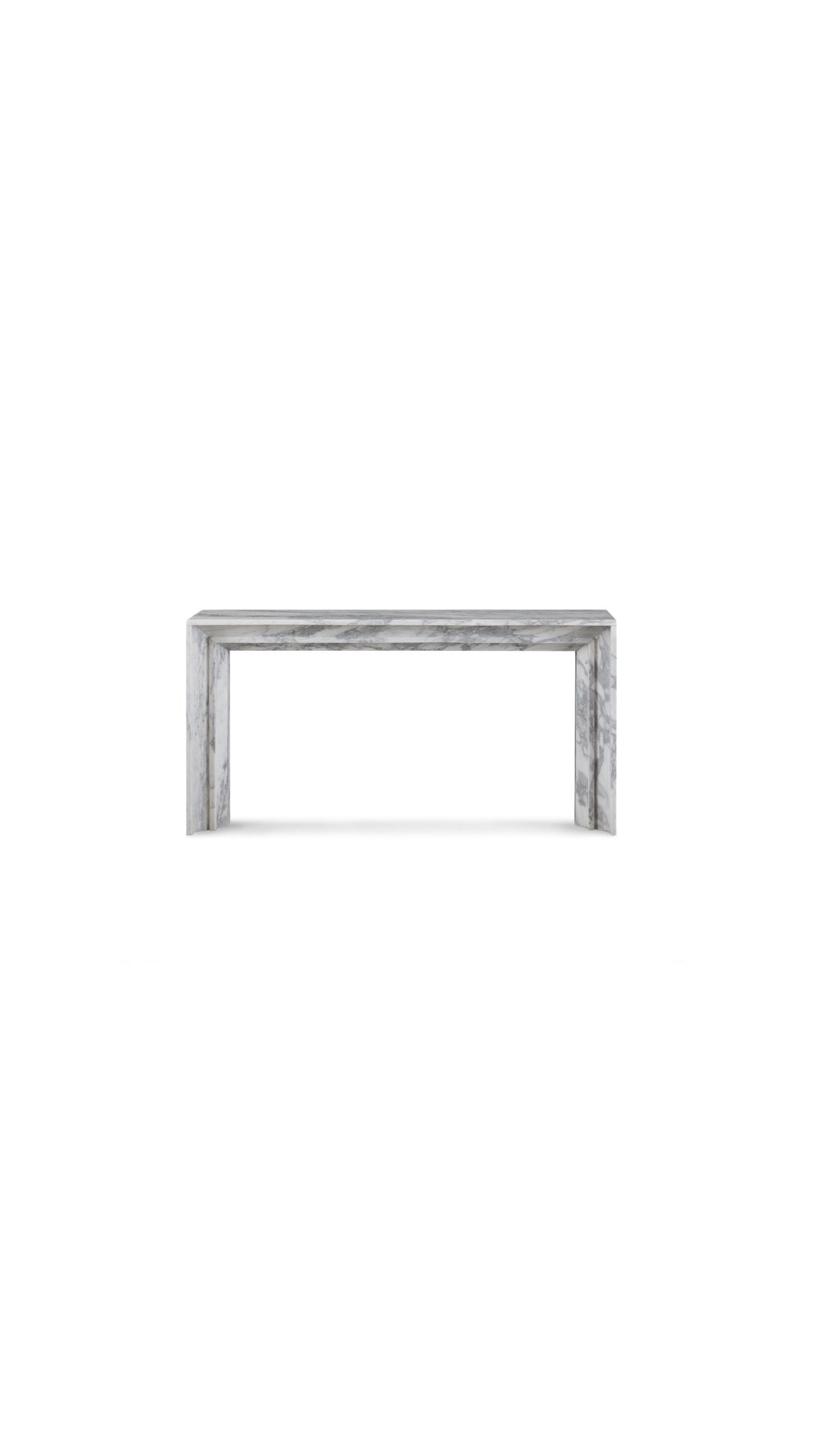 The Angelo Console is attention-getting from every angle, with modern bolection styling carved from white Arabescato marble.