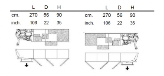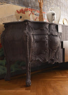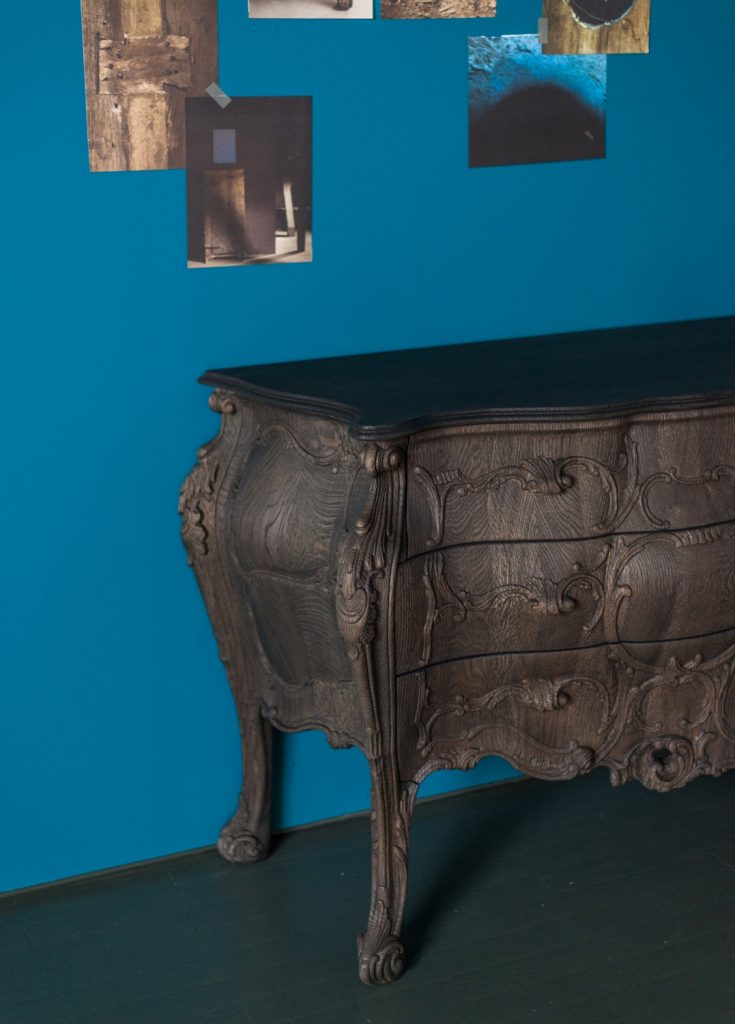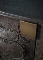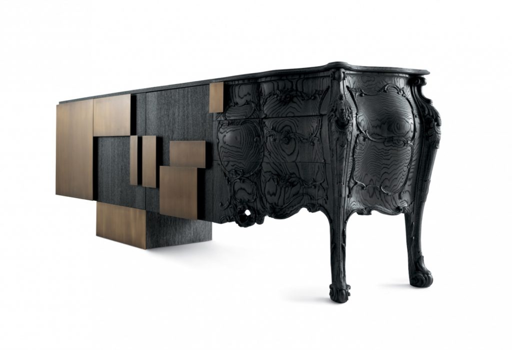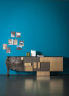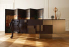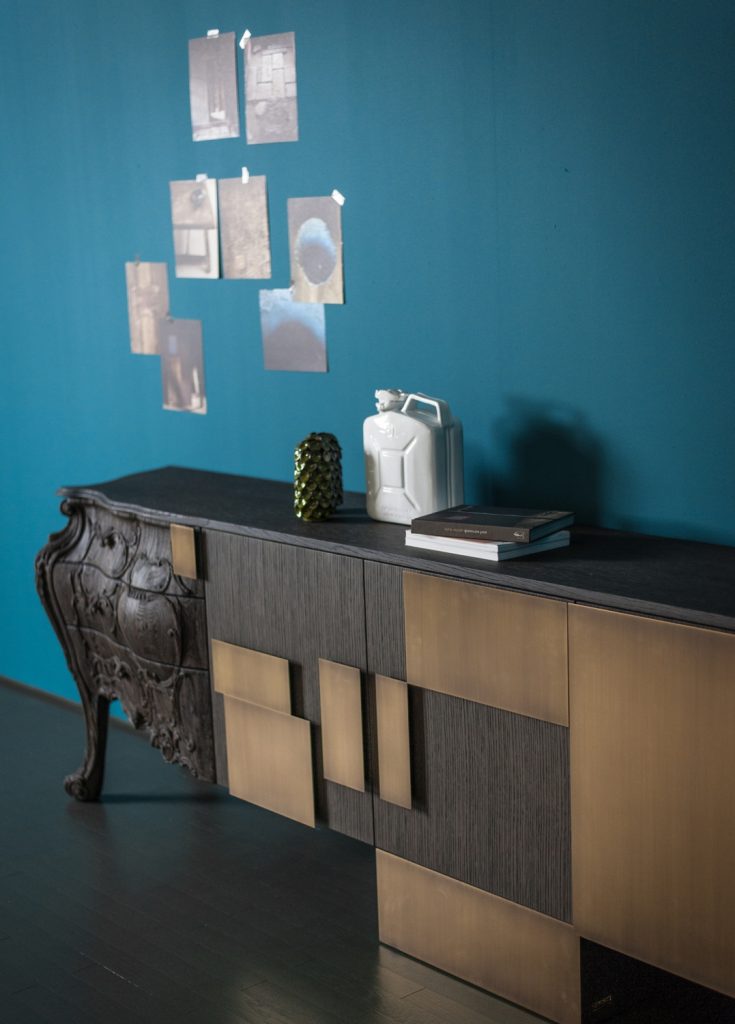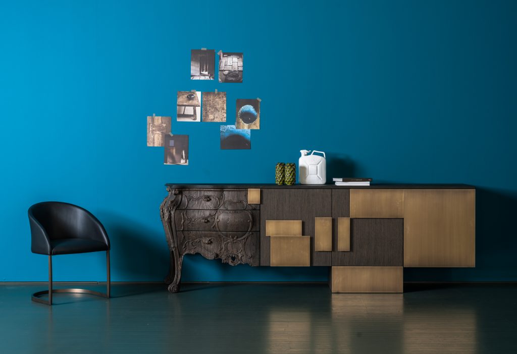 Evolution Sideboard made combining old and modern woodcrafts. The classical side is made of blocks of solid wood, vertically placed, and carved by hand. The modern side is, instead, made of veneered multilayer wood. Then, the sideboard is completely sandblasted. The classical side is equipped with 3 drawers with wooden runners, the modern one with one wooden shelf per space. The handles and the frontal side of the base can be in brass or in steel.