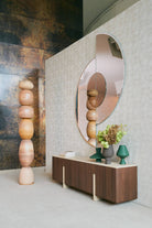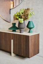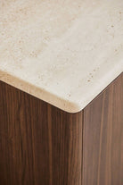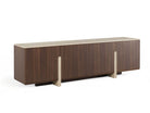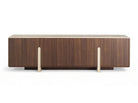 The Zen Palatine echoes a similar effect to the dining table. The decorative concave travertine detail is repeated in the double legs that come up along the front, intertwining with the flush doors. The sideboard also features a Roman travertine top with softened edges, juxtaposing itself to its deep Canaletto walnut veneer sides.