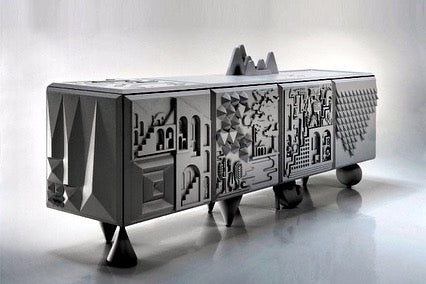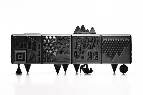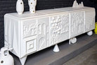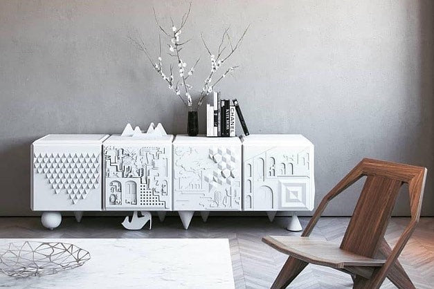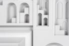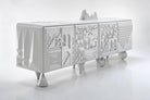 Modules and shelves made of lacquered MDF available in greyish white, micro-textured white or client’s own chosen custom RAL. Doors, flat top(s), sides and leg AM04 are of injected integral polyurethane with a chipboard support. Solid alder wooden legs in a microtextured lacquered finish (in the same colour as the piece).