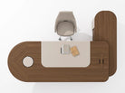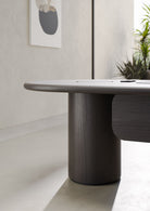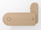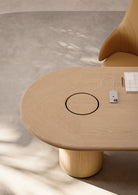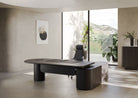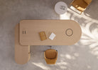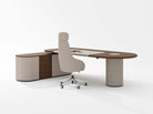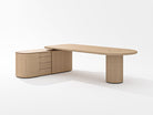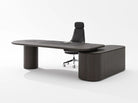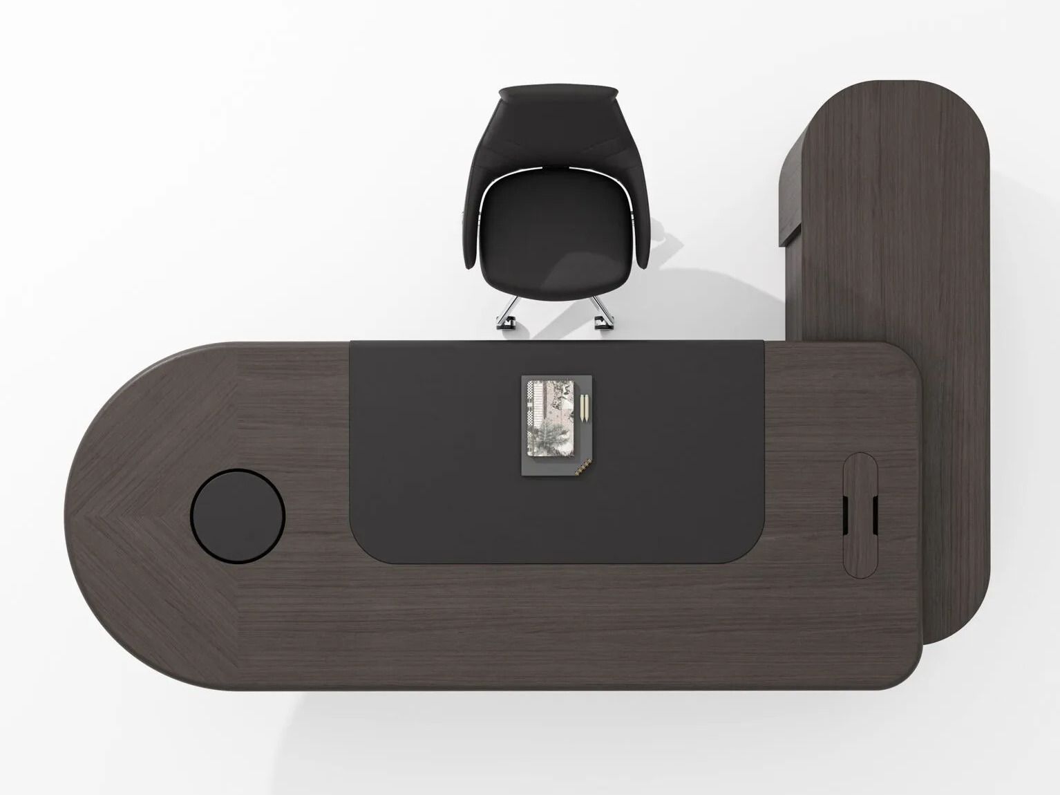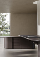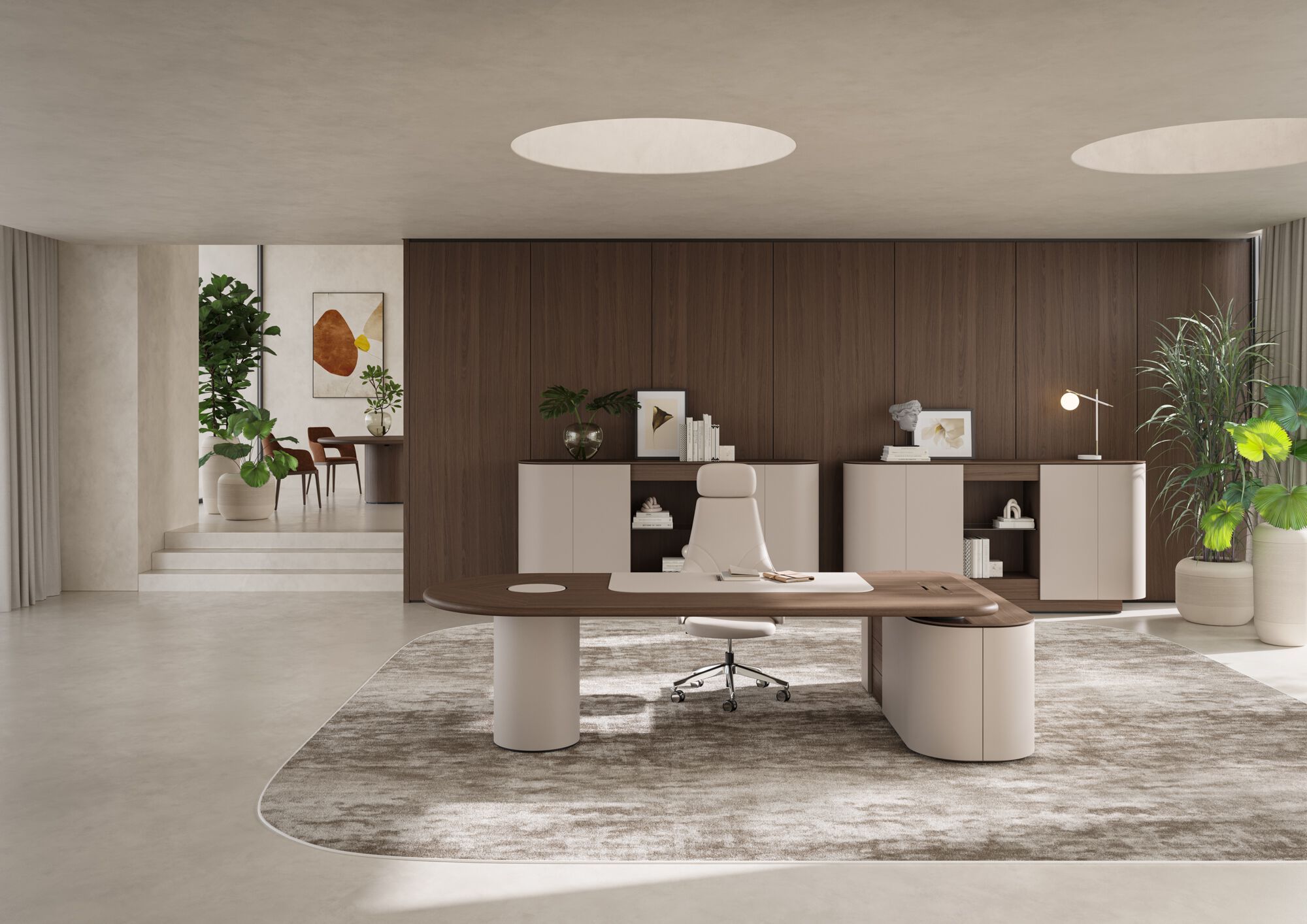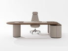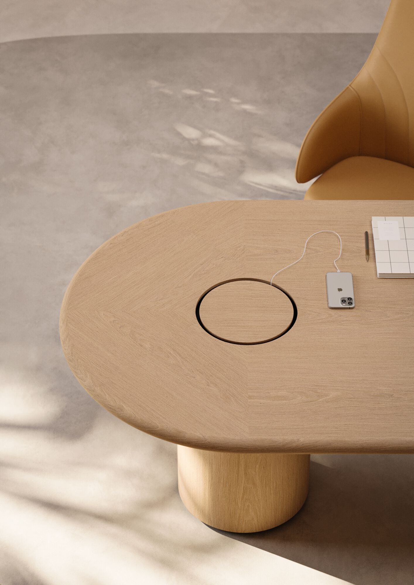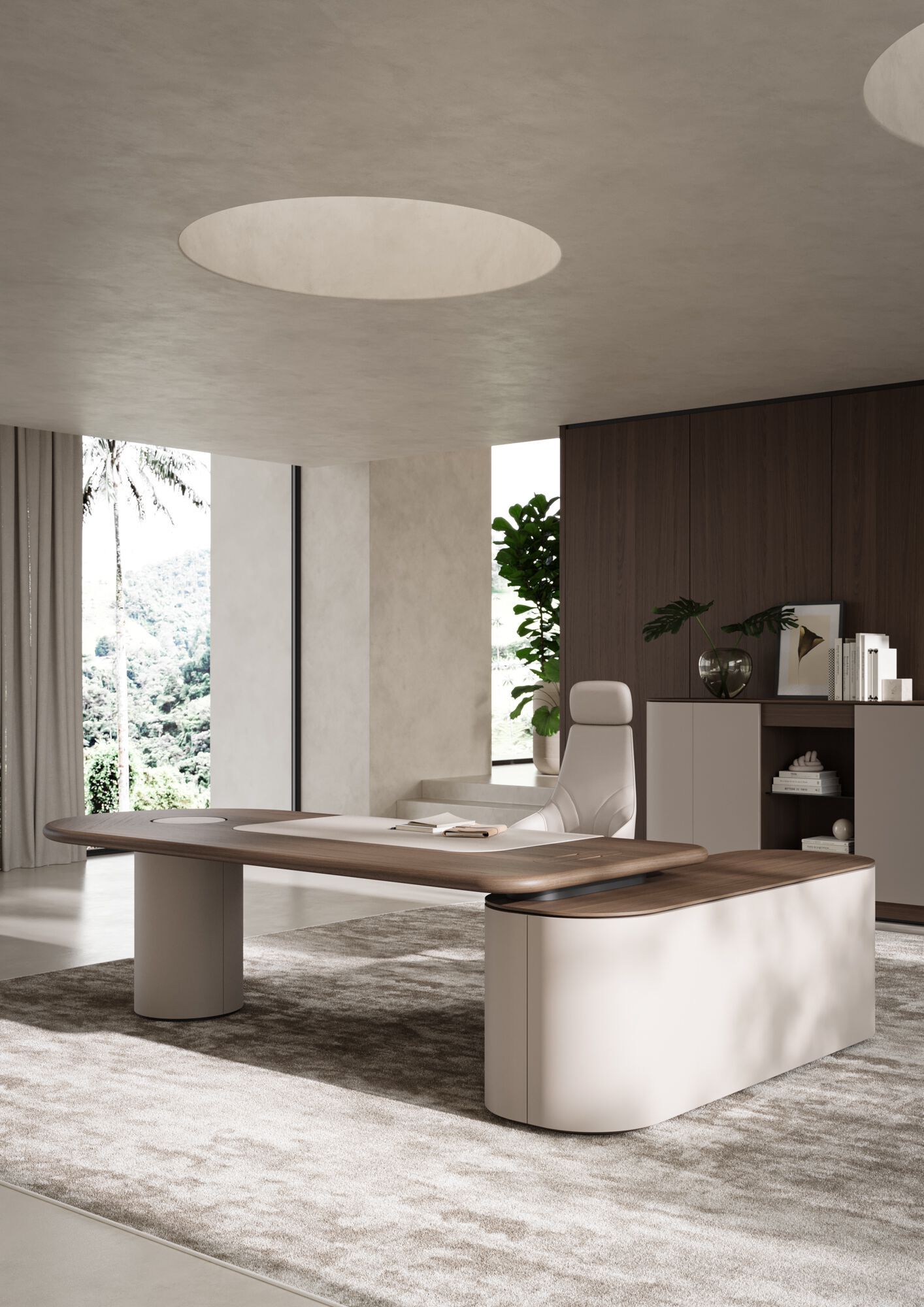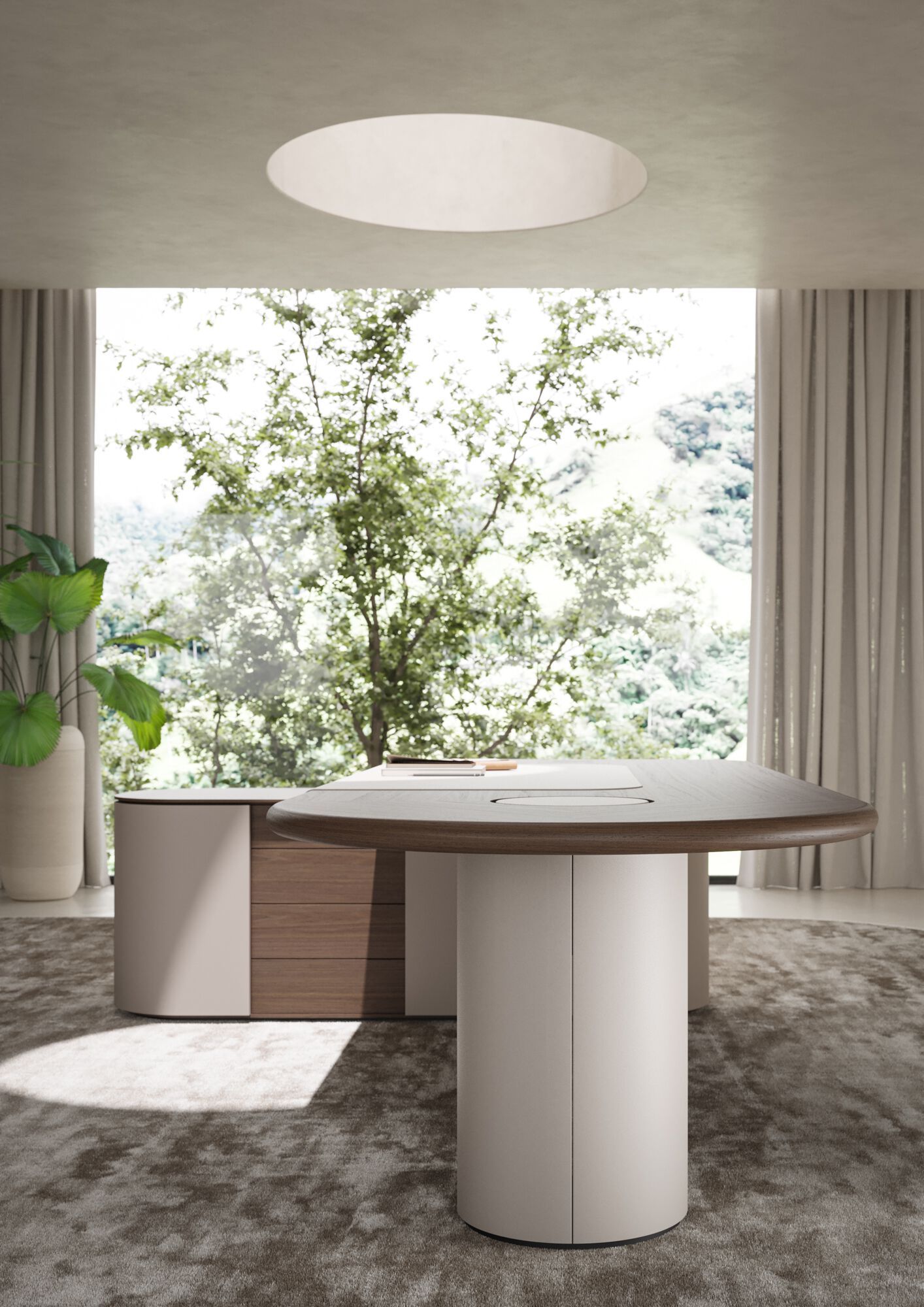 The desk, with a simple structure but enhanced by delicate curves, conveys a feeling of fluidity and lightness. The wide, curved work surface is made of high-quality materials such as veneered wood and leather, which enhance its elegance. The central part and legs can be upholstered in leather to add a touch of prestige and functionality. A cable tidy and an electronically liftable round insert are integrated in the top, concealing the electrification. The legs follow the soft lines, creating a harmonious contrast with the solidity of the top.