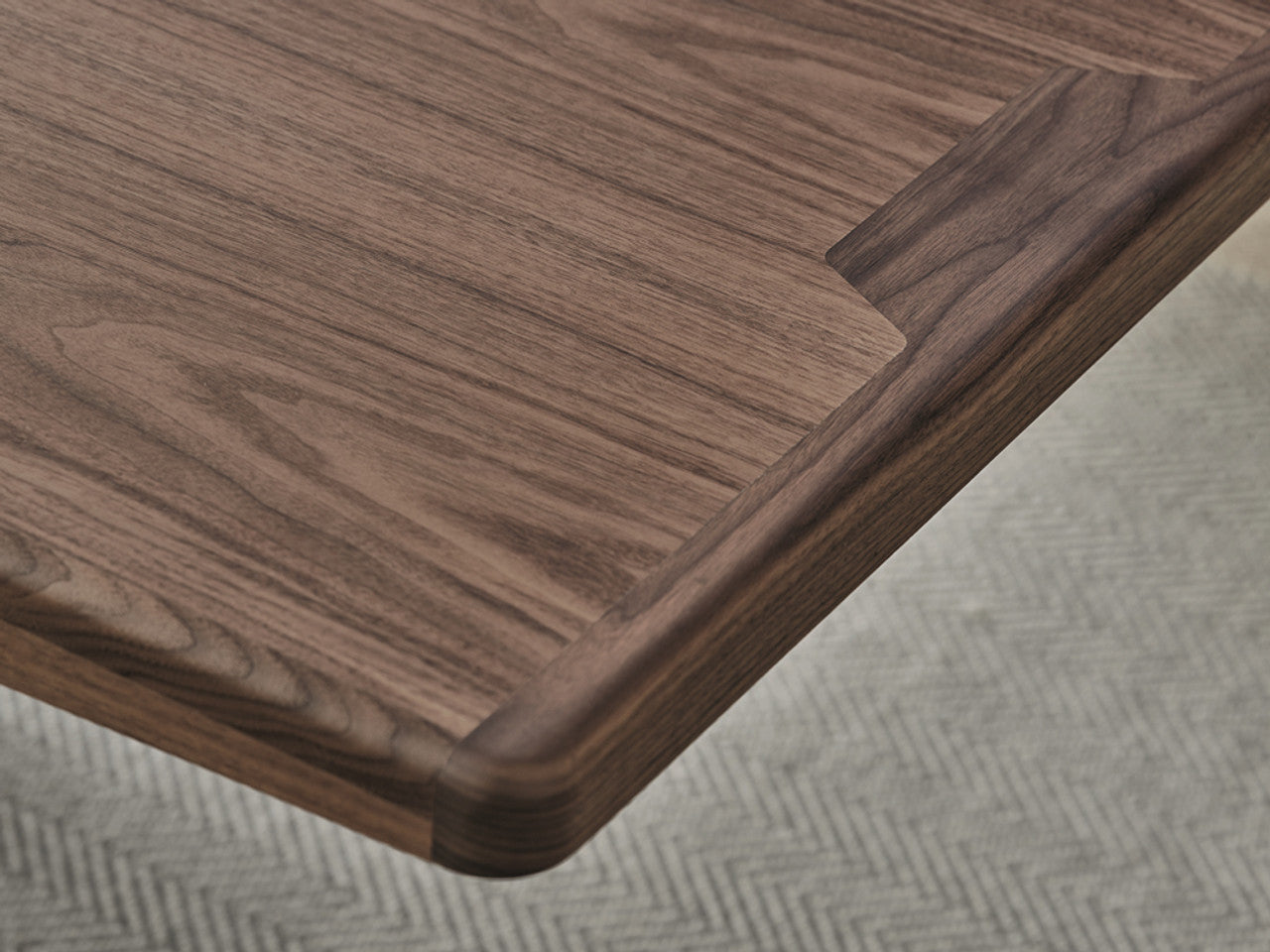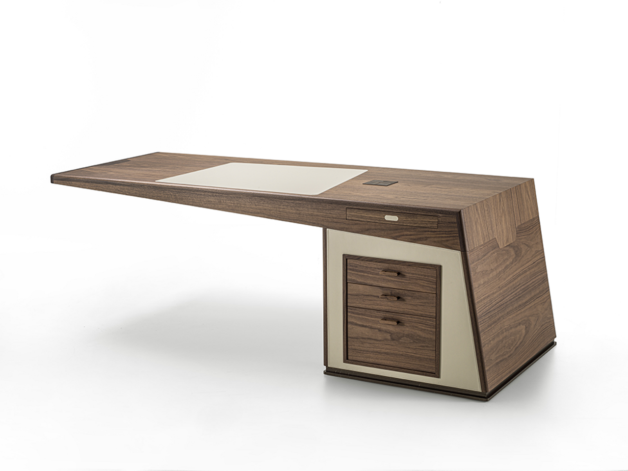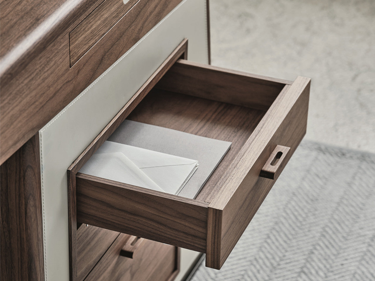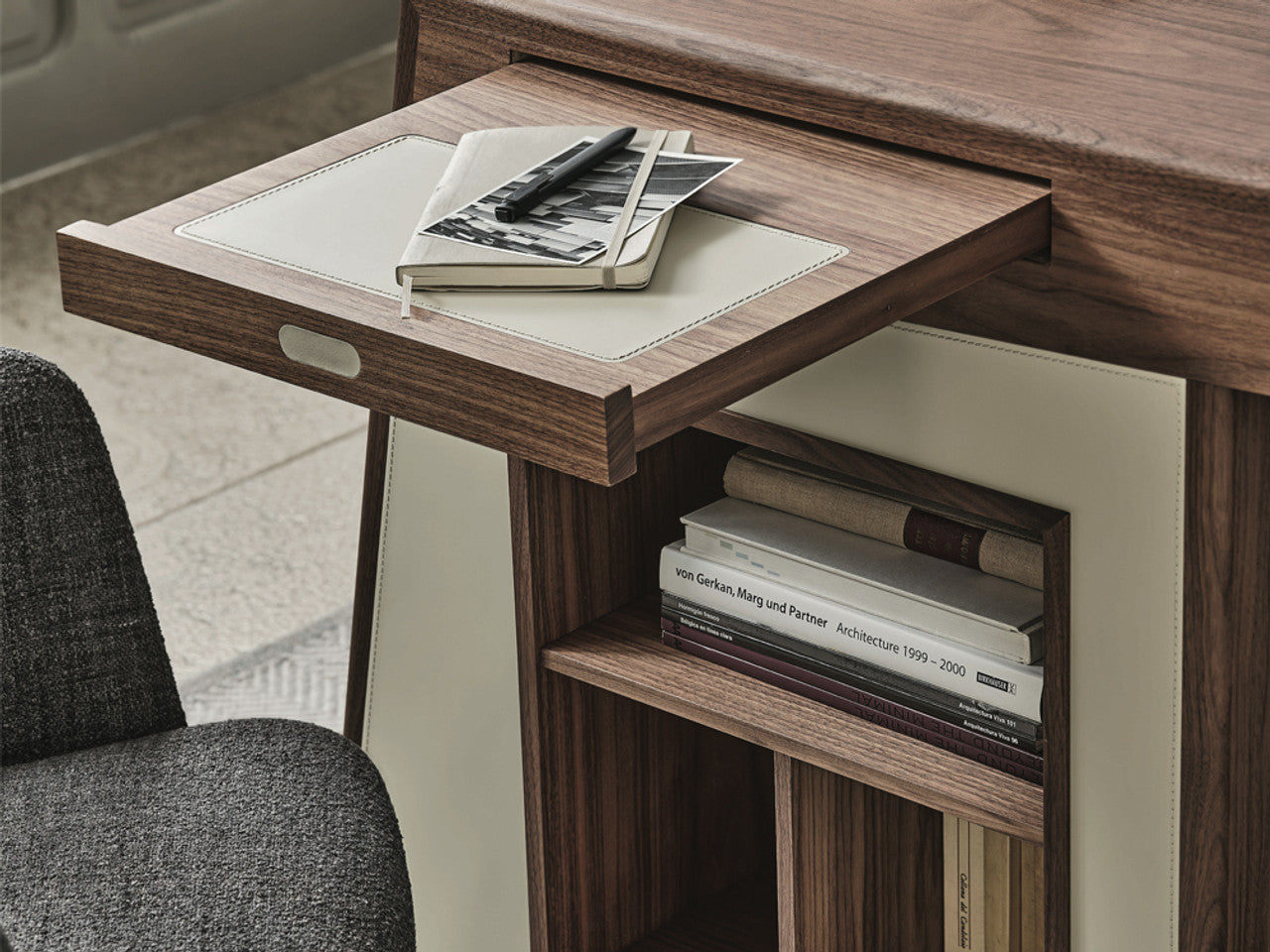 Writing desk in canaletta walnut with Cuoietto inserts on the top and on the side cabinet fronts. The cabinet is equipped on the inside with pull-out shelf for pencils, two drawers and a file drawer with soft closure and on the outside with pull-out shelf and open compartments. The top is equipped with one Schuko and two USB pop-out plugs.