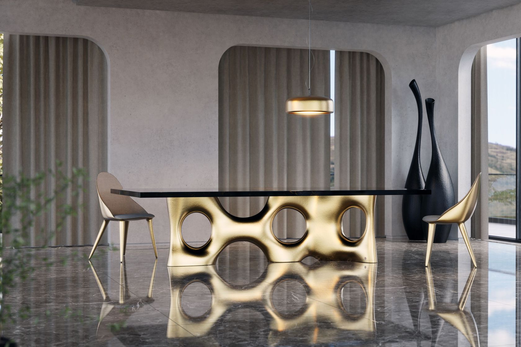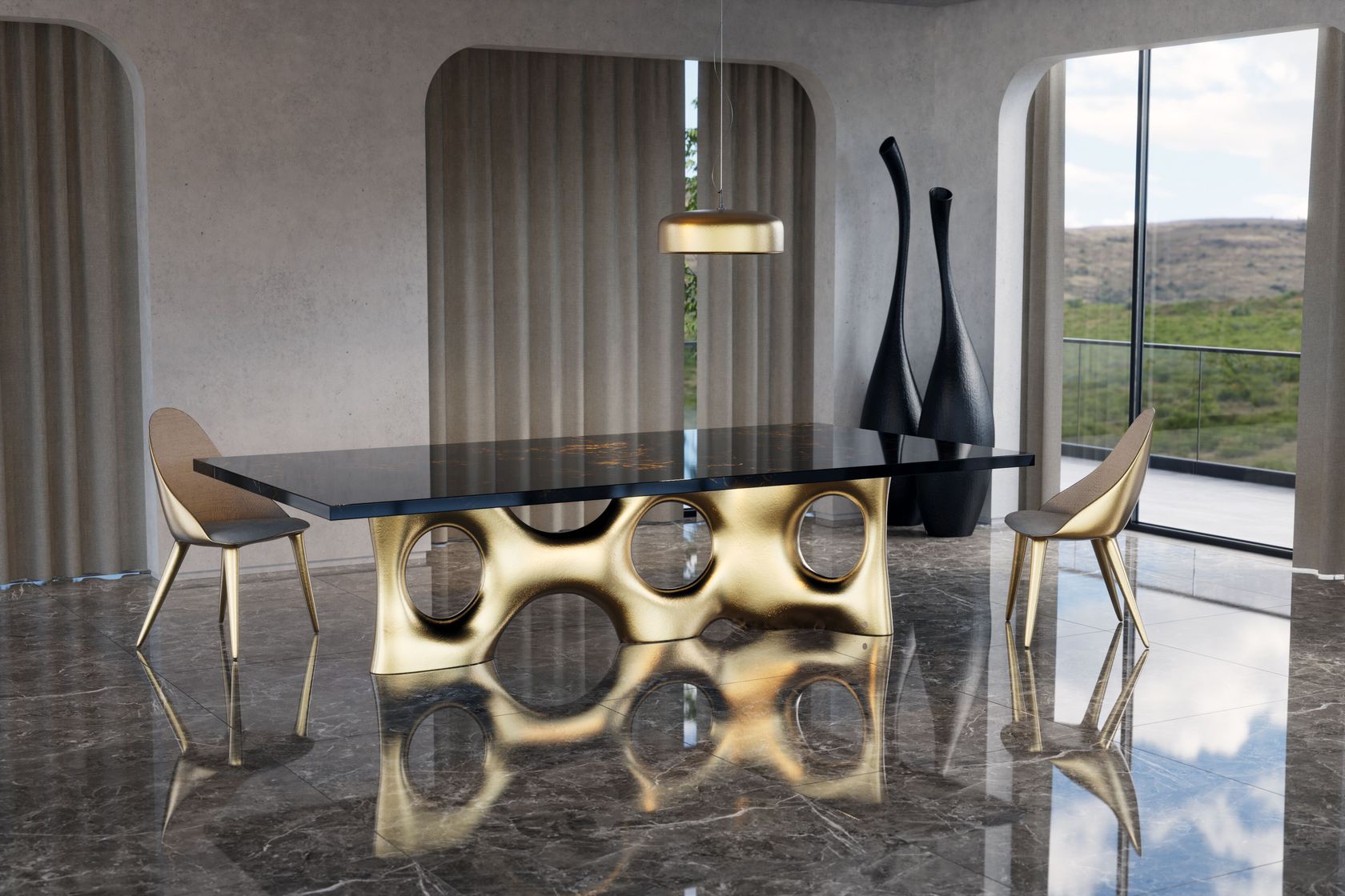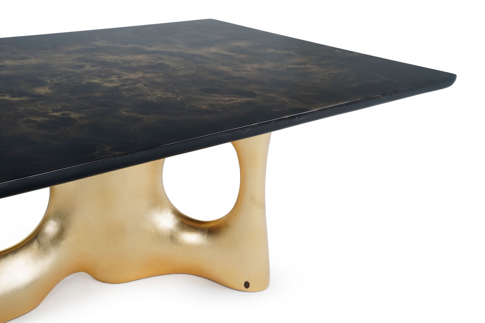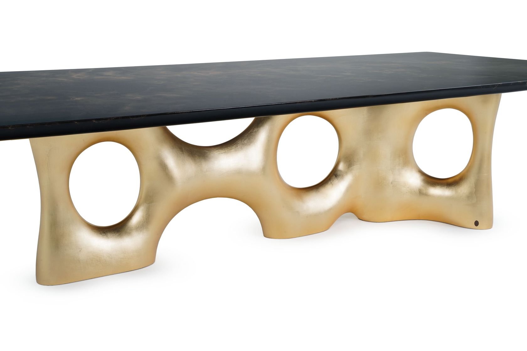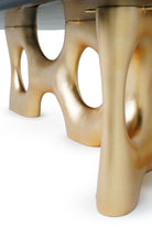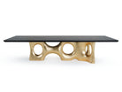 Cosmic is a dining table distinguished by its sculptural grandeur. The rectangular tabletop boasts an exclusive black & gold marbled finish, adding an air of sophistication to every gathering. Embrace the sculptural and bold silhouette finished in gold leaf that defines Cosmic, turning your dining area into a showcase of artistic refinement. Each curve and contour tells a tale of unparalleled craftsmanship, making this dining table a statement piece that transcends the ordinary, offering a harmonious blend of artistic allure and contemporary sophistication.