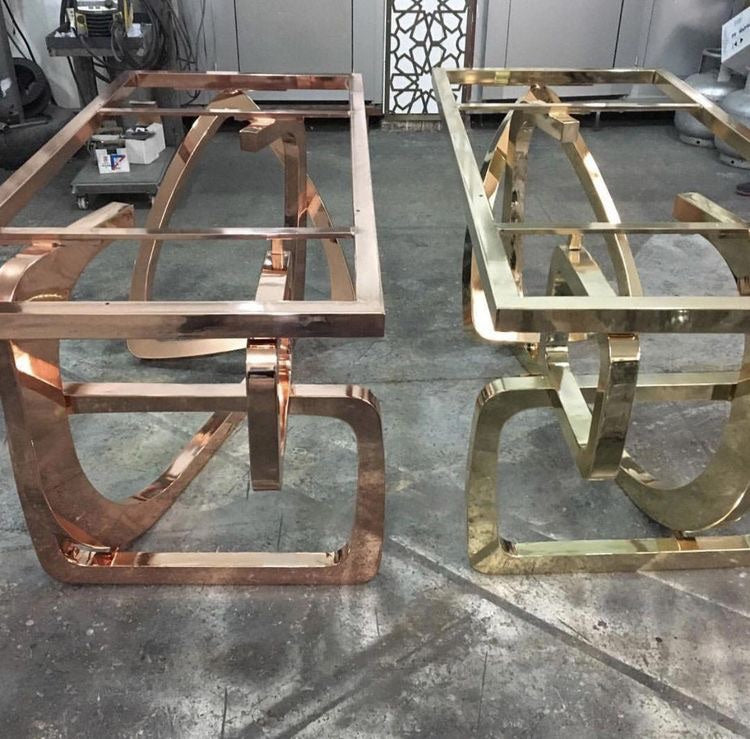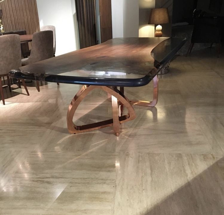 Epoxy Resin Live Edge Asymmetrical Bangle Brass Intermesh Dining Table.