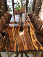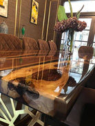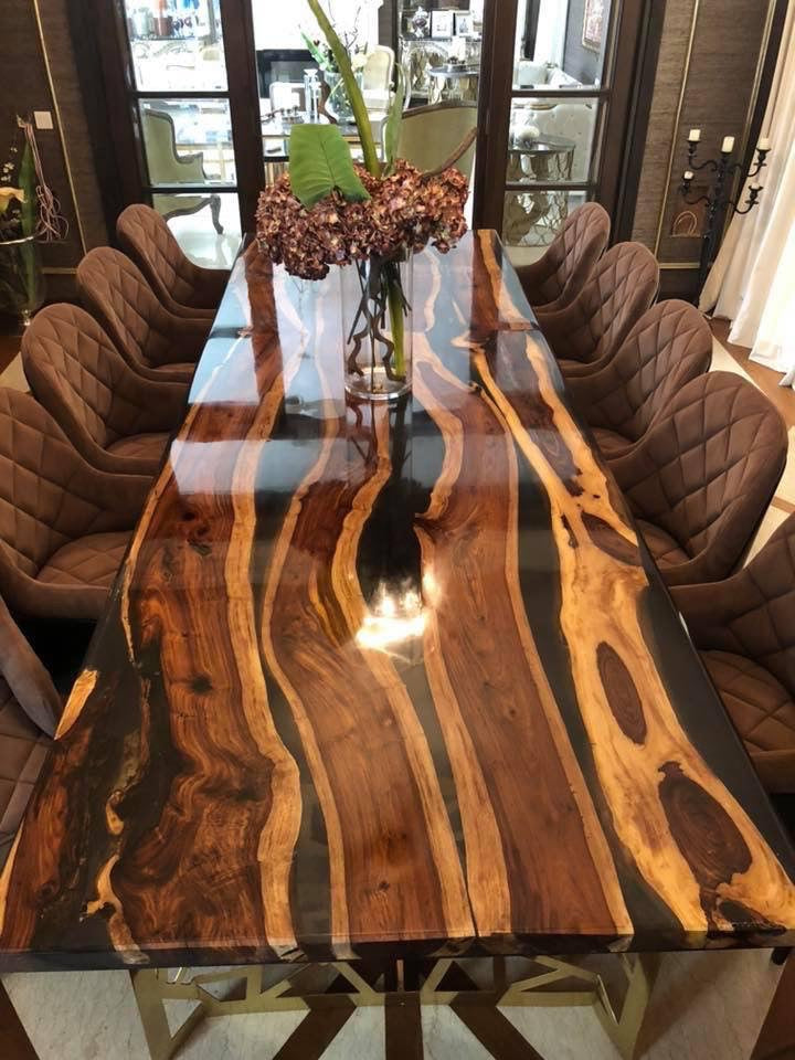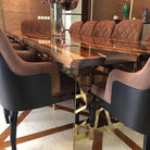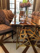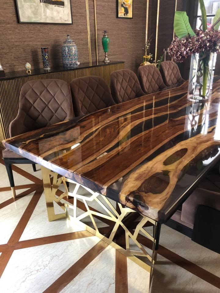 Epoxy Resin Sunken Live edge Rose wood Brass Metal Mesh Dining Table.