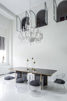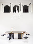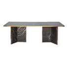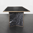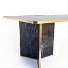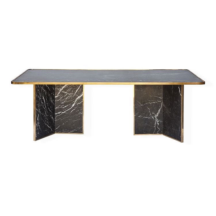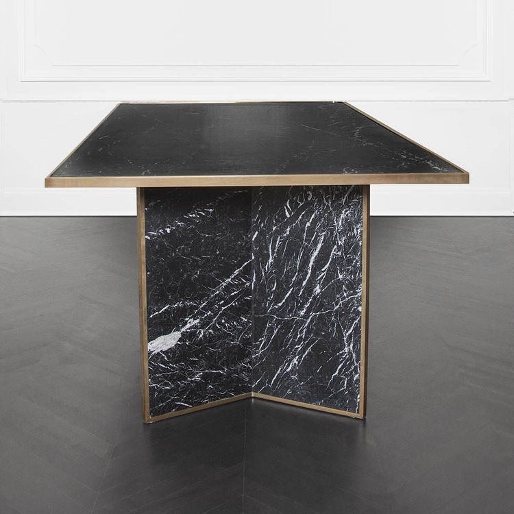 Light structured metal bases in a black or bronzed brass finish match solid volumes covered in various kinds of marble, wood or lacquered finishes and are freely combined with differently shaped tops giving life to an interplay of solids and voids.