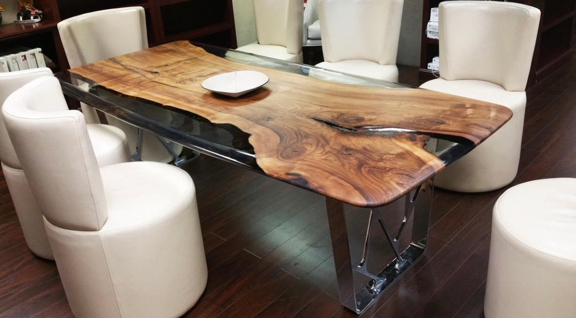 Smoked Epoxy Resin Live Edge Metal Mesh Dining Table