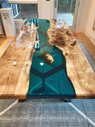 Sacramento Pine Green Epoxy Resin Live Edge Dining Table.