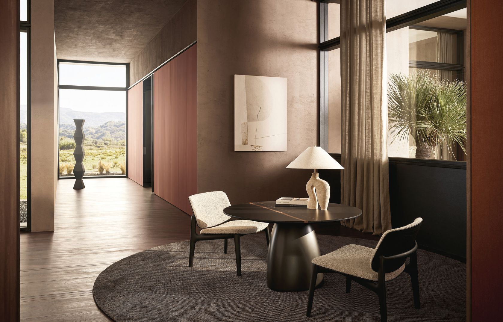 For the indoor version of the Monolith collection, Emmanuel Gallina reinterprets the archaic lines of the dolmen with warm and precious materials. The top is in black elm or travertine marble, which combined with the foot in the same finish gives life to a monolith with an imposing and monumental appearance.