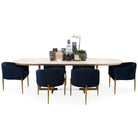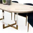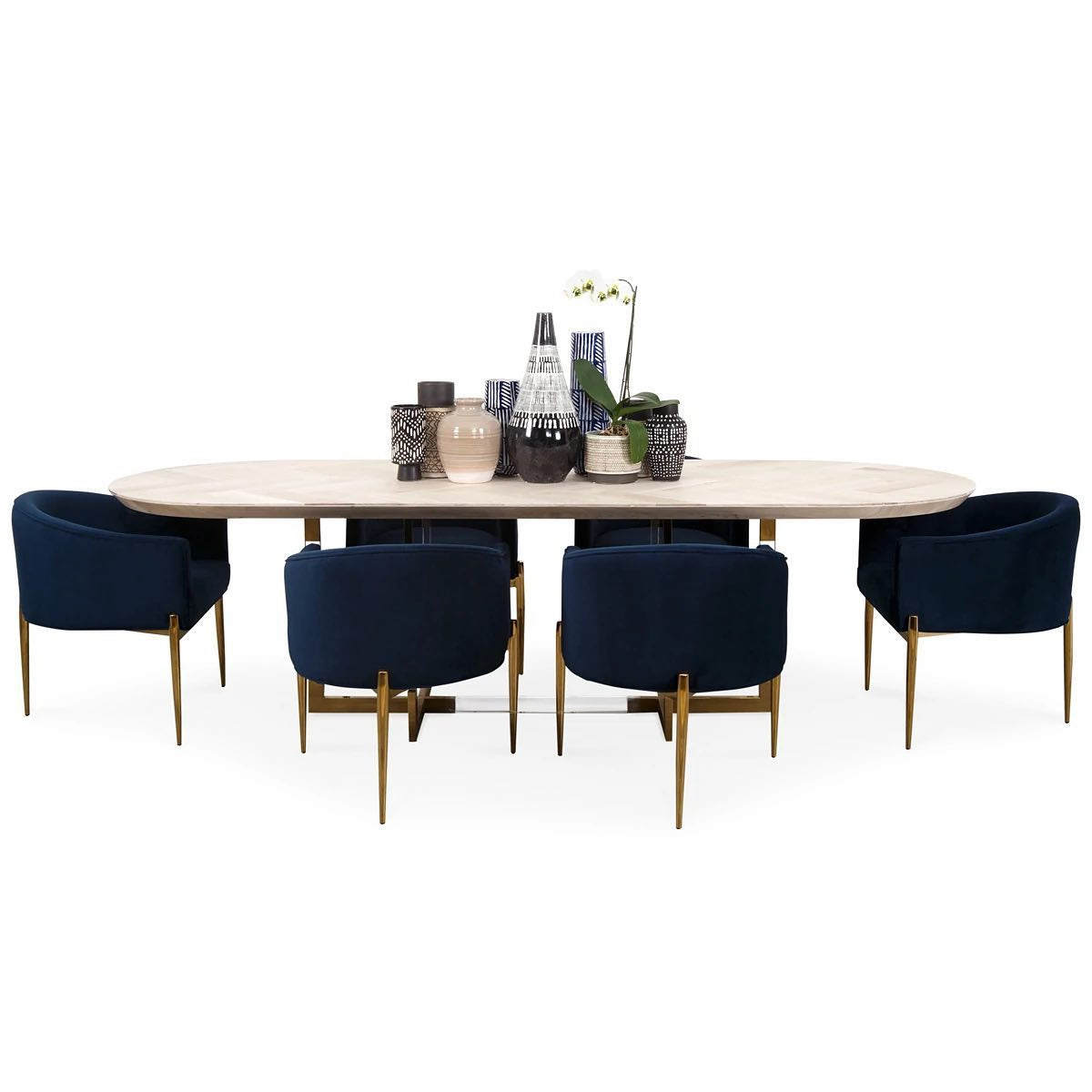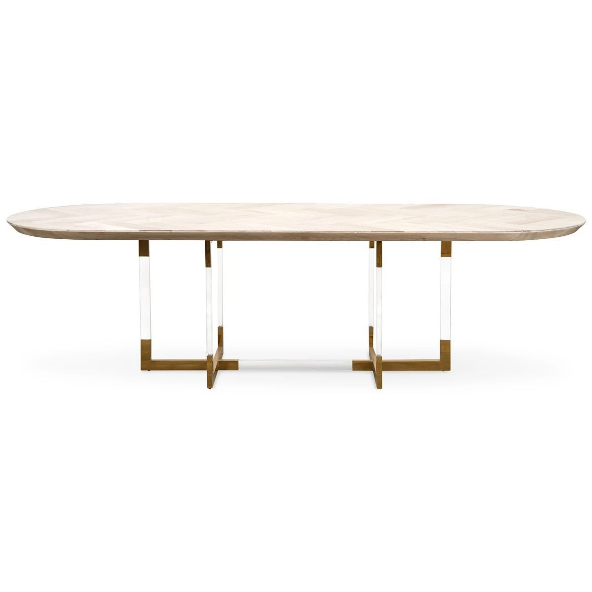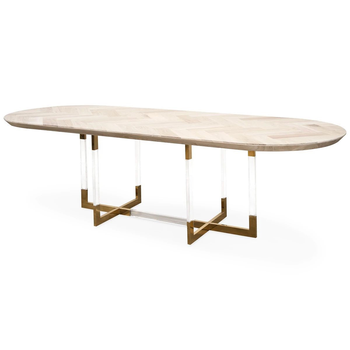 The Torfu Collection gets a beautiful new addition with the Torfu Racetrack Dining Table. Featuring bleached walnut in a herringbone pattern and a Trousdale base of Lucite and shiny brass, the Torfu is mix of natural beauty and man-made elements. Due to the uniqueness of the natural wood grain, no two will be identical, making your Torfu Racetrack Dining Table truly one of a kind.
