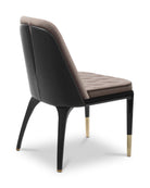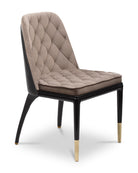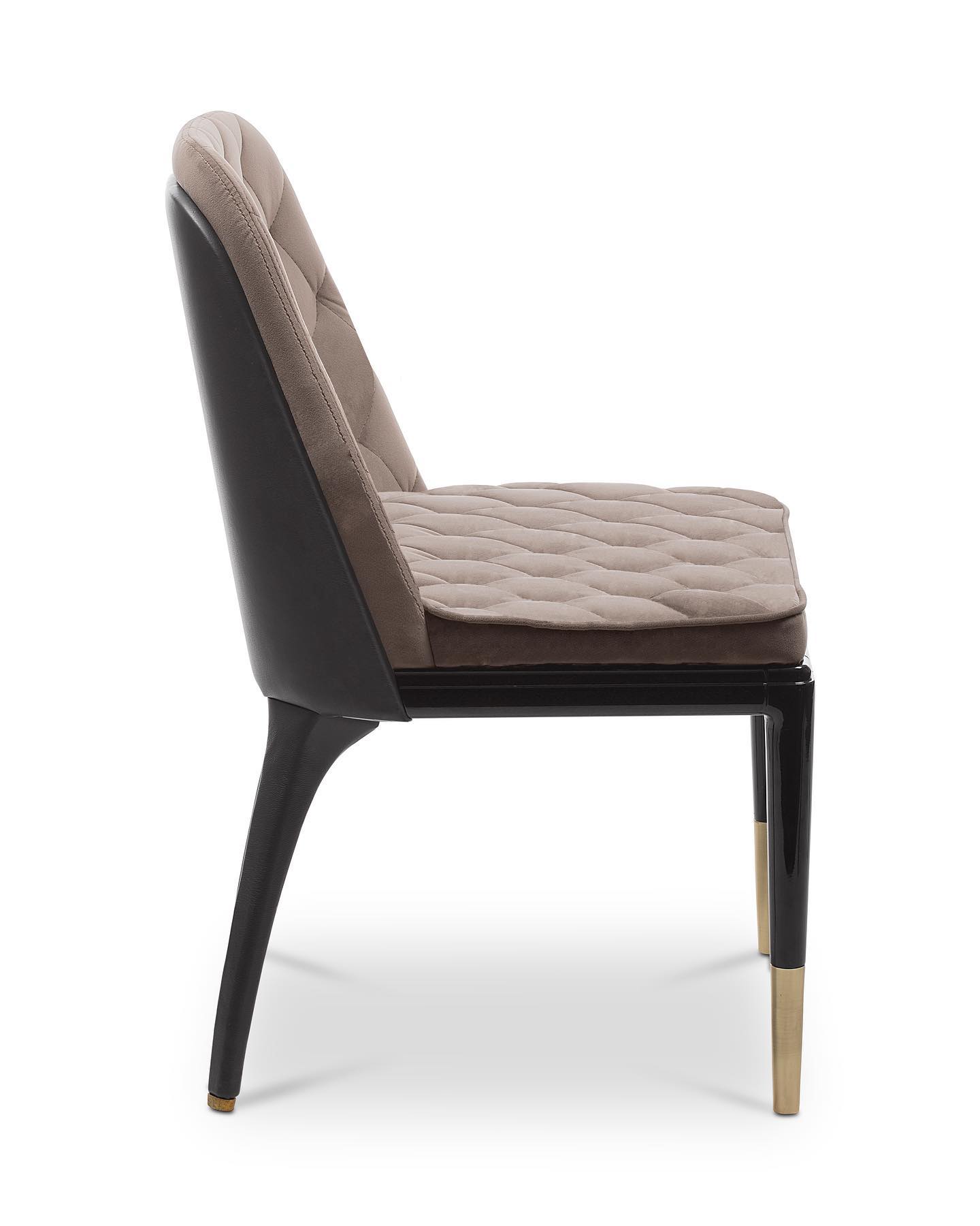 Charla dining chair is a splendid object of boundless elegance. This marvelous design is the perfect example of timeless lines with a modern twist, by using a complexity of luxurious materials, such as velvet,Brass Polished Feet and lacquered wood.