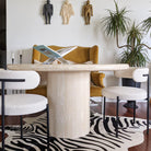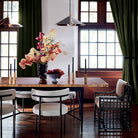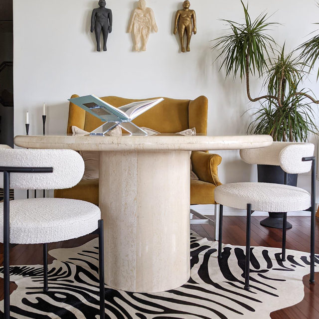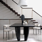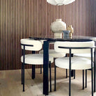 Steel tube with matte black finish frames a modern, Italian-made dining chair. Textural ivory boucle wraps the curved back and round seat in luxe contrast.