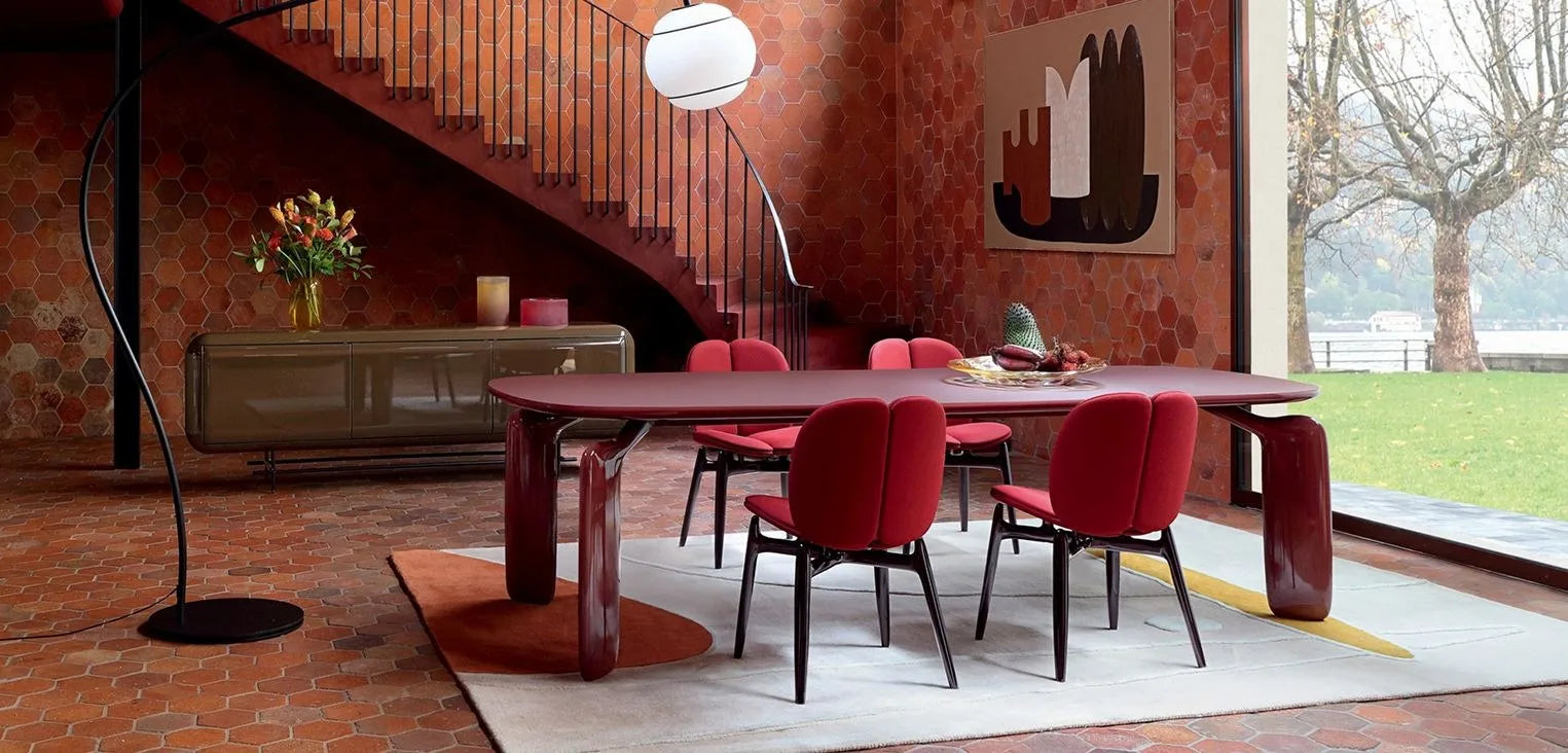 collection of tables, chairs and armchairs with a biomorphic aesthetic that eschews straight lines and is complemented by refined finishes.