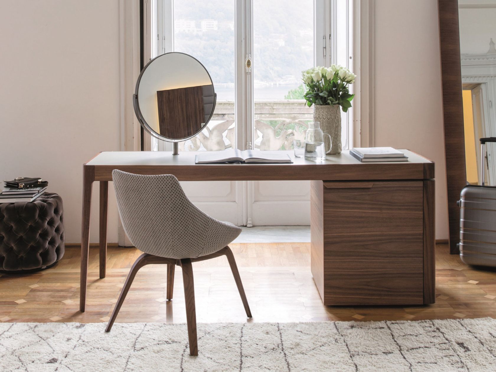 AFRODITE is a writing desk with frame in solid canaletta walnut or matt lacquared, side element with three drawers. Top in wood, cuoietto, marble or glass. Drawers can be placed on the right side or on the left side. Mirror available for wooden or cuoietto top only.