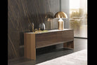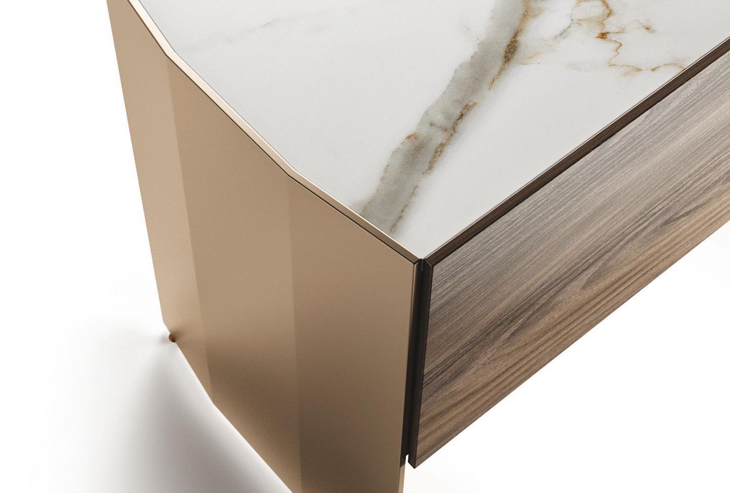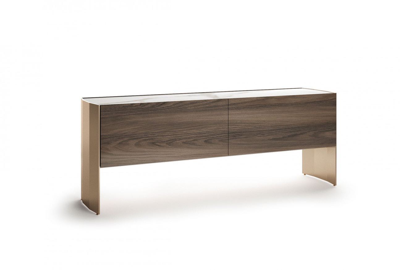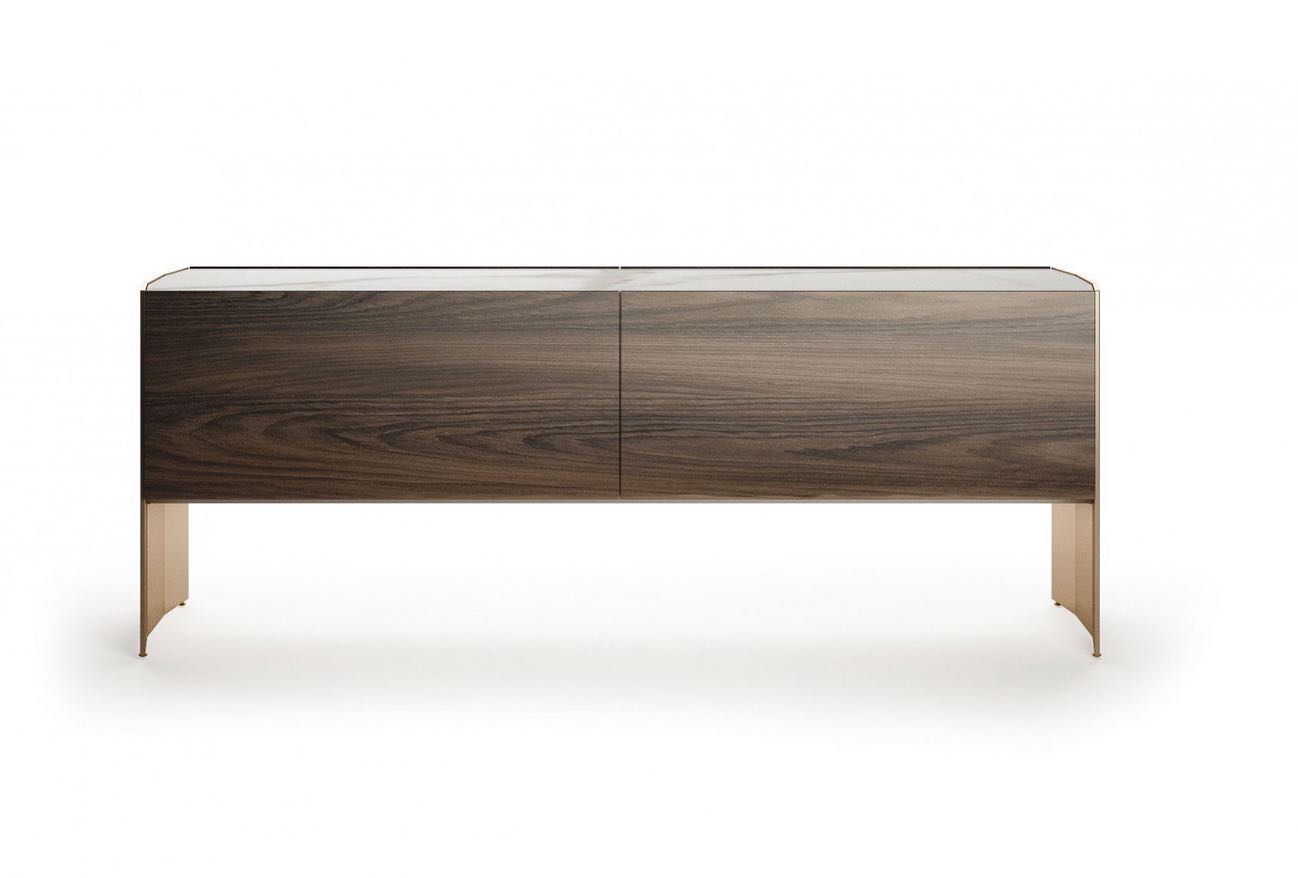Milvian features some sublime and sophisticated styling, combining bold lines with the finest detailing. The flowing wood structure is framed by curved side panels, which feel pleasant to the touch and draw the gaze as they continue to the floor, where the transform gracefully into feet. There is a wonderful sense of balance to the piece, with customers able to choose the finish for the top from the large number of options in the range. Also available the version with fixed front for double-sided use.