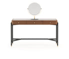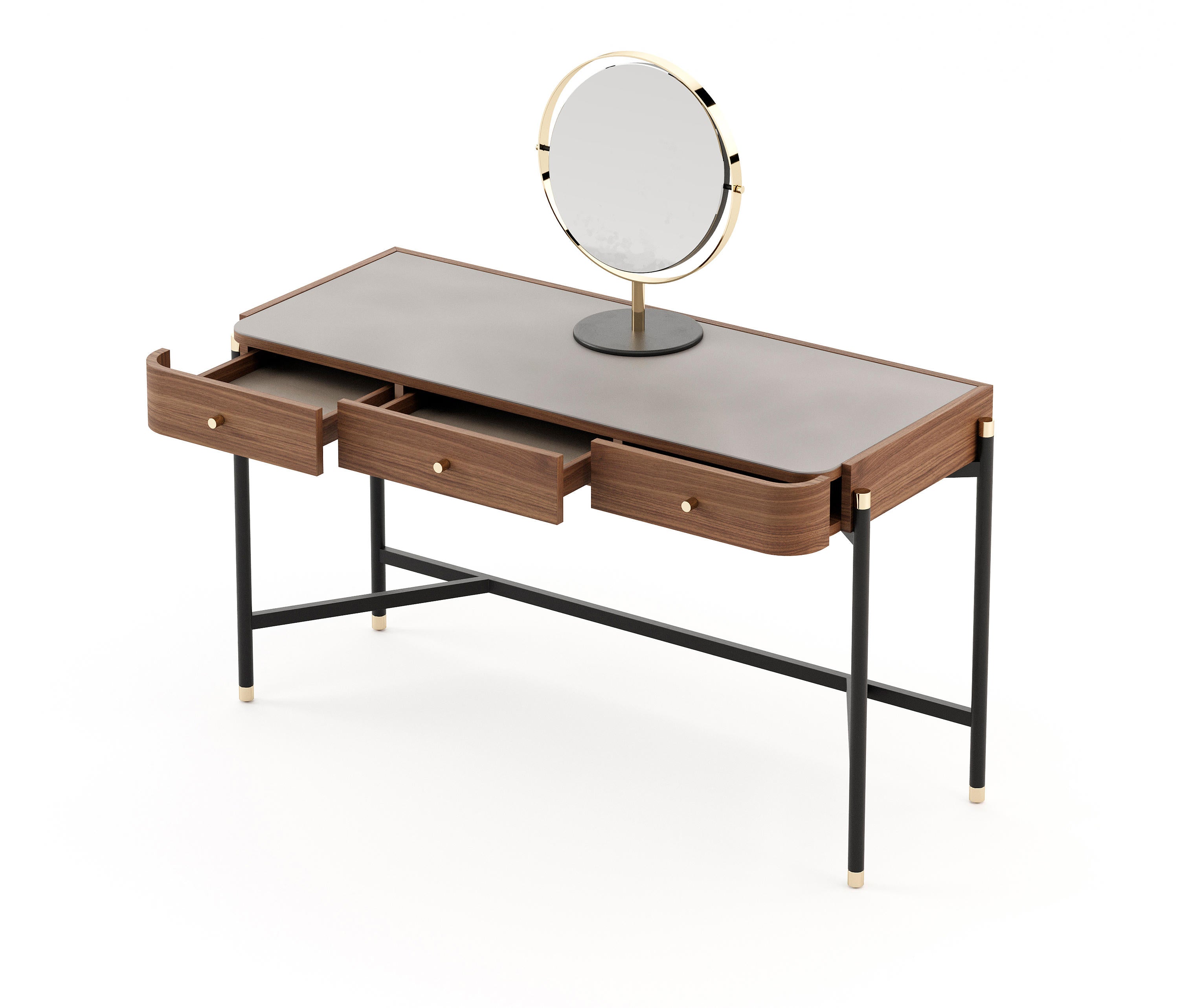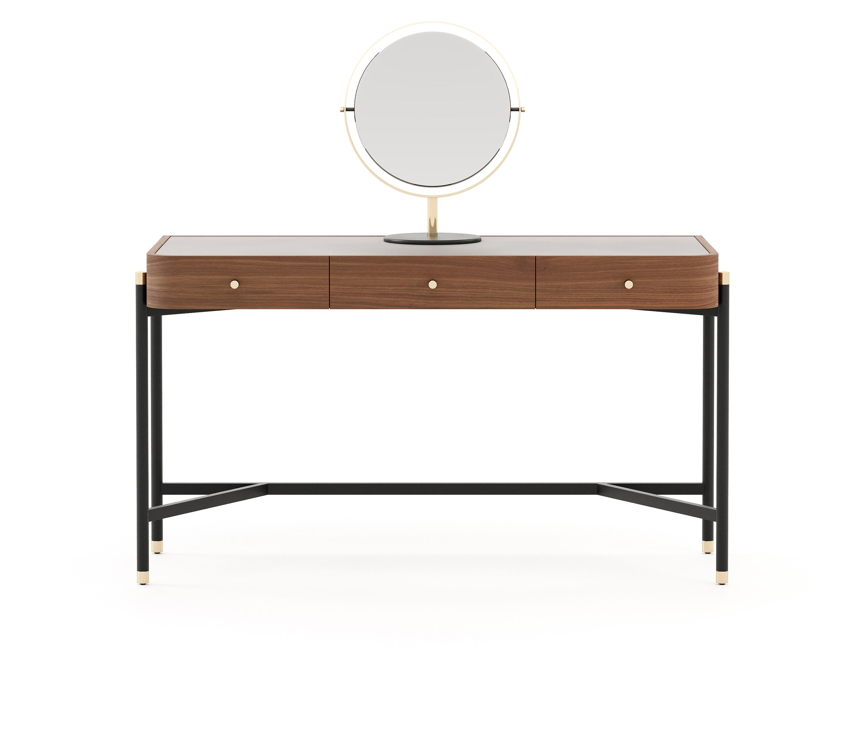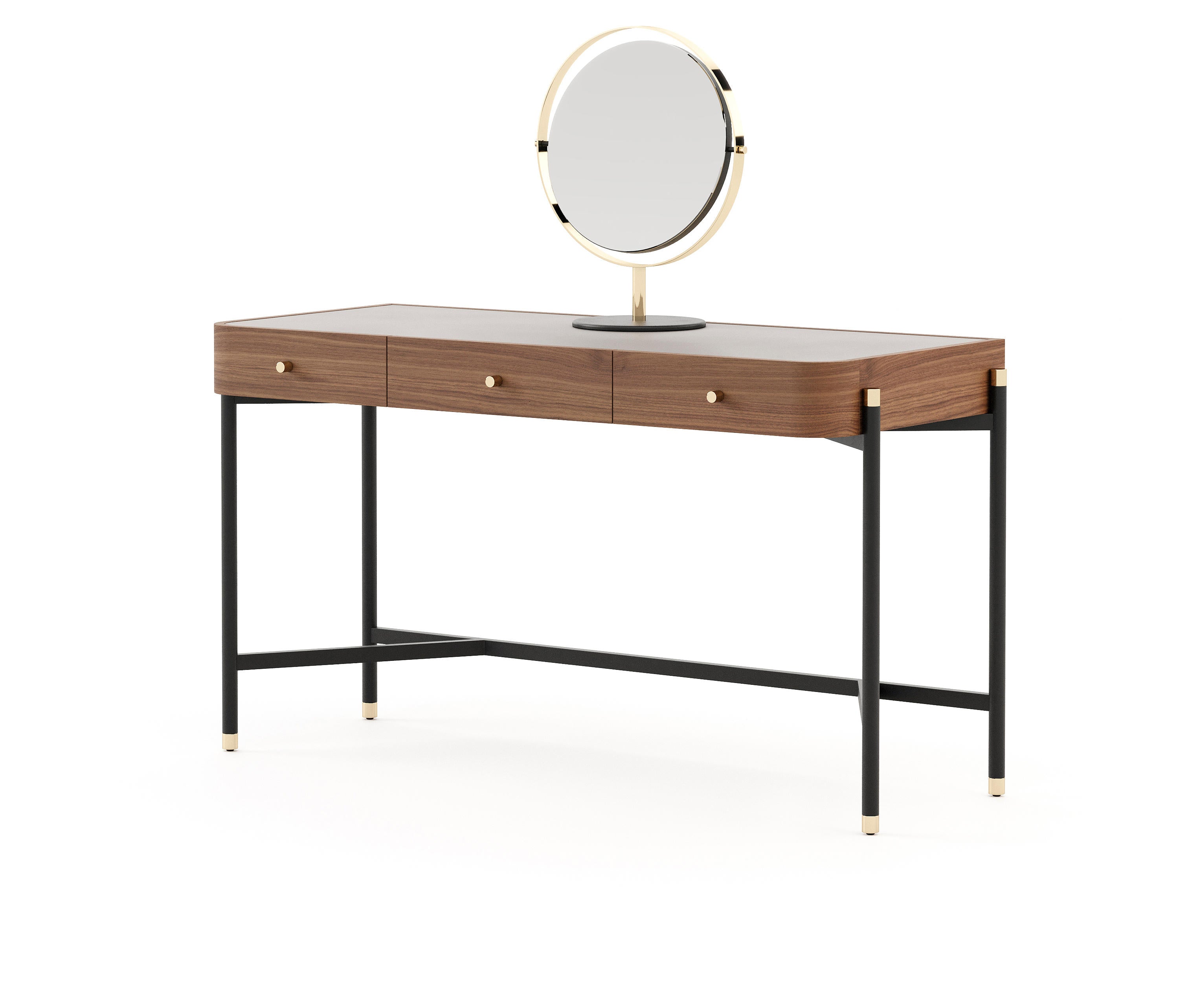 Rosie dressing table is an iconic feminine piece that adds elegance to any bedroom. Exploring mid-century style with seductive lines, this is a dressing table with a timeless essence. Rosie is an outstanding addition to a glamorous bedroom or classic boudoir. With a sleek iron structure supporting a three-drawers graceful body, this chic table offers one bullseye mirror with a metal frame.