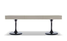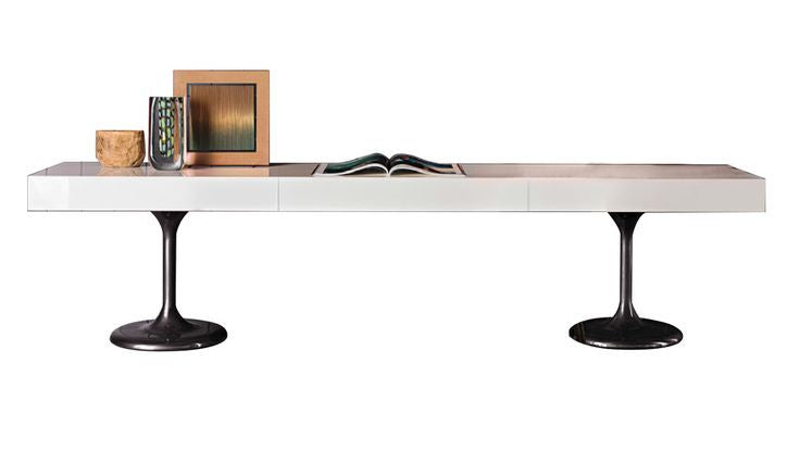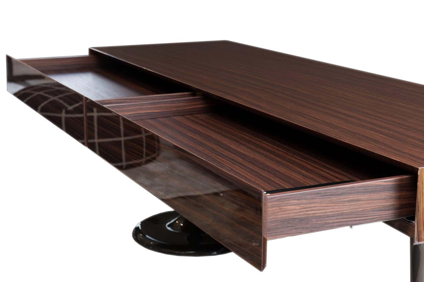 Aluminum with metal load-bearing structure and counterweight plate. The base is available in a glossy Pewter-colored finish. Internal drawers in composite Walnut veneer with matt finish to match all of the finishes for the external structure, fully extendable drawer slides with Blum Motion closing mechanism.