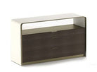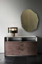 Chest of drawers with 3 drawers, upholstered in leather, with bronze details.