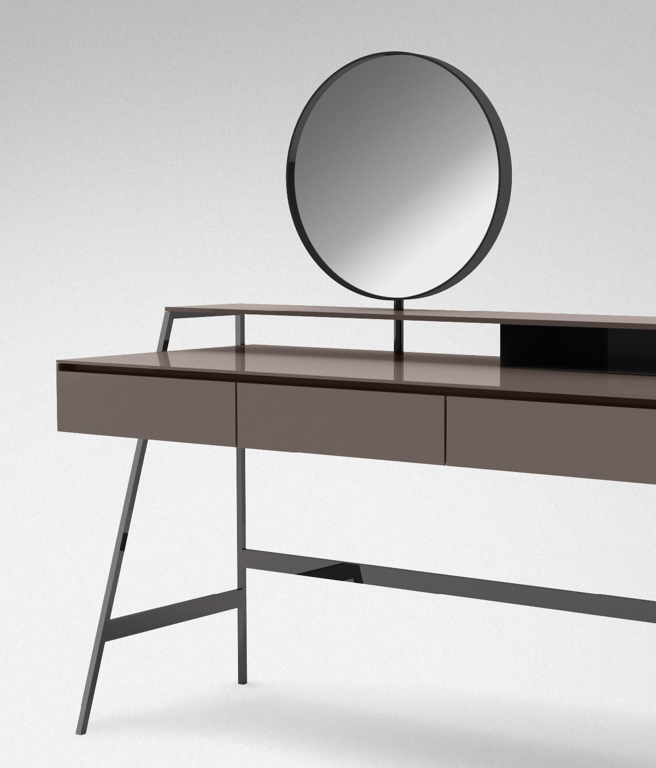 With a vintage taste, Venere is an actual and feminine vanity. Covered by painted glass, as per samples in the bright or satin version. Adjustable double face mirror diam. 20". Chestnut with “fabric” touch effect lacquered drawers.