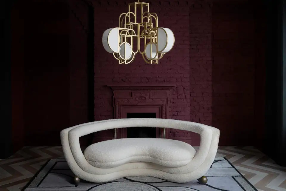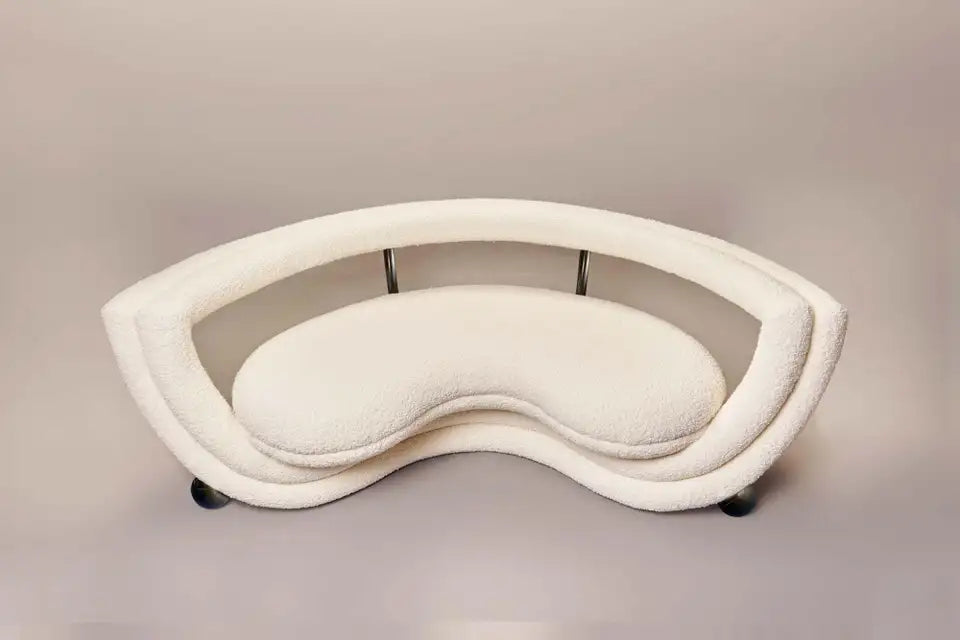 Kissing Armchair features two semi-circle layers; one bearing the cupped seat and a second forming the back-rest. All the lines are covered with soft upholstery apart from the metal legs and metal cups, which hold the upholstered seat like an ice cream coupe. It is reminiscent of an open mouth, ready to chat, eat and kiss.