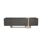 Although it exhibits the overpowering asymmetrical presence and the keen linearity of the collection, Titano Sideboard has a rather tactical standpoint compared to the other members or the series. The cabinet body combines two uneven cuboid blocks meshed around the hollowed-out stone pillar. A rigorously curated void between the cabinet doors exposes the tangible quality of the natural stone pillar, and the recessed section of the top end brings extra function to the sideboard. A metal leg supports the extended wing that conceals an additional unit with a drawer. The glaring, almost blady nature of the swallowtail leg contrasts and balances the round corners and the sanded surface of the wooden cabinet. All materials are locally produced; the stone pillar comes in travertine and marble options. The sanded solid wood and metal surfaces have numerous color alternatives.