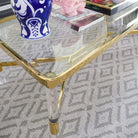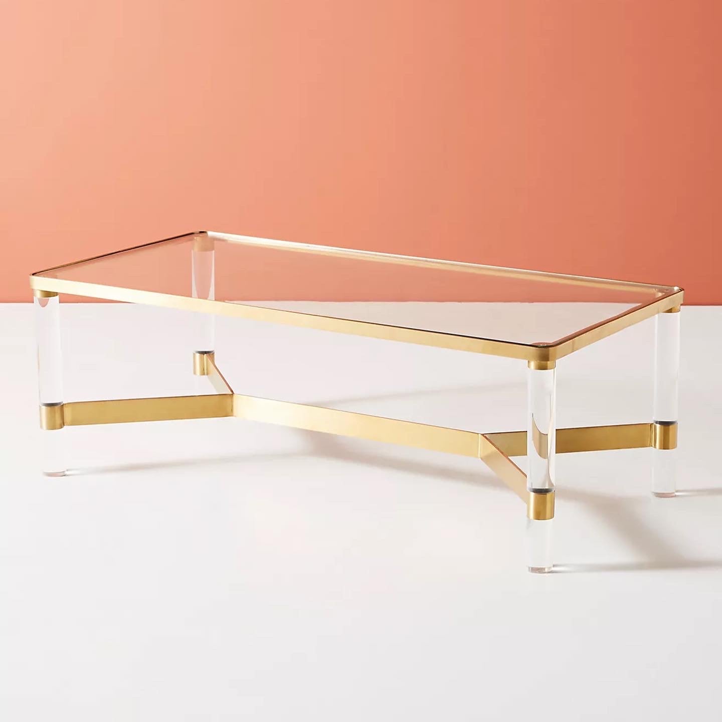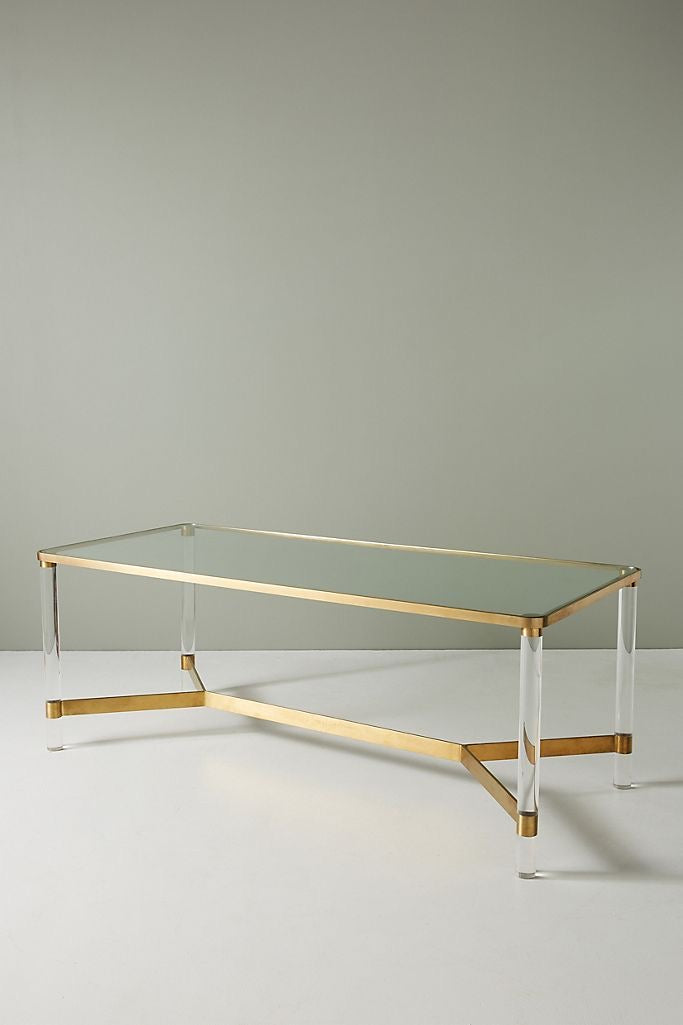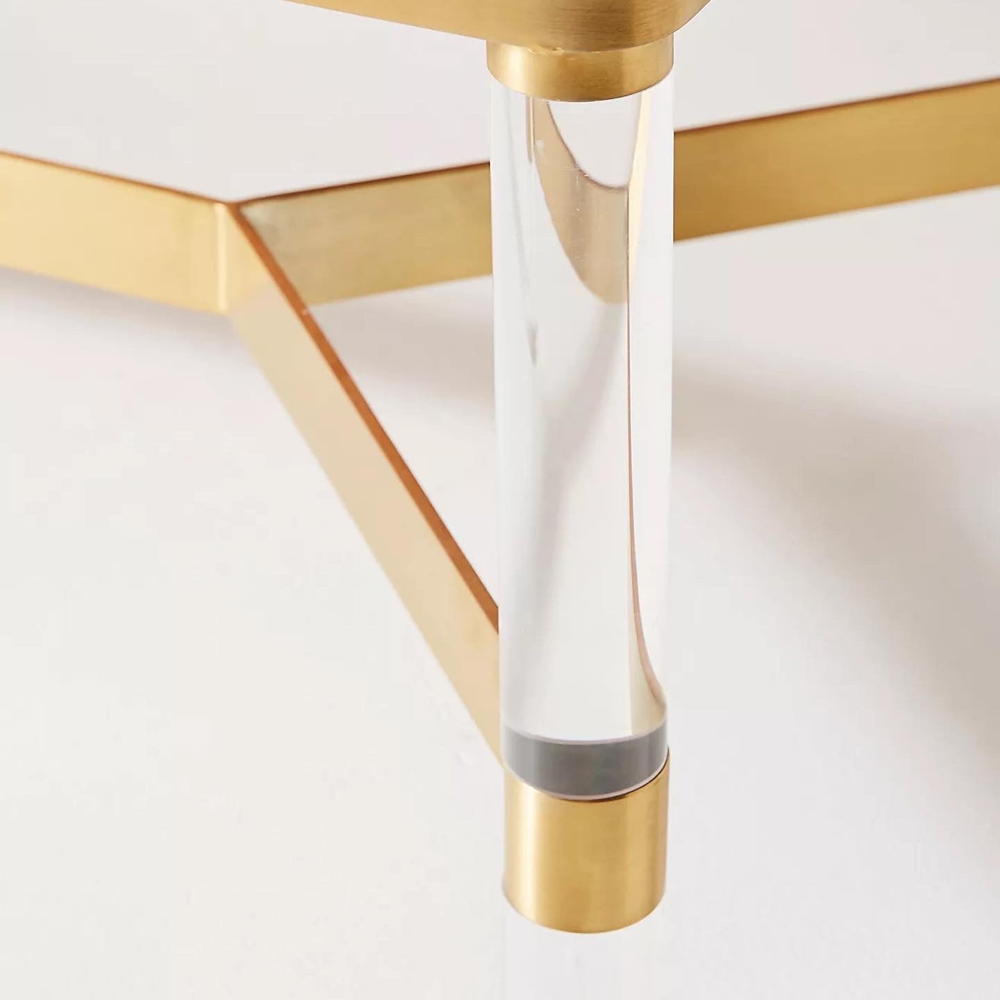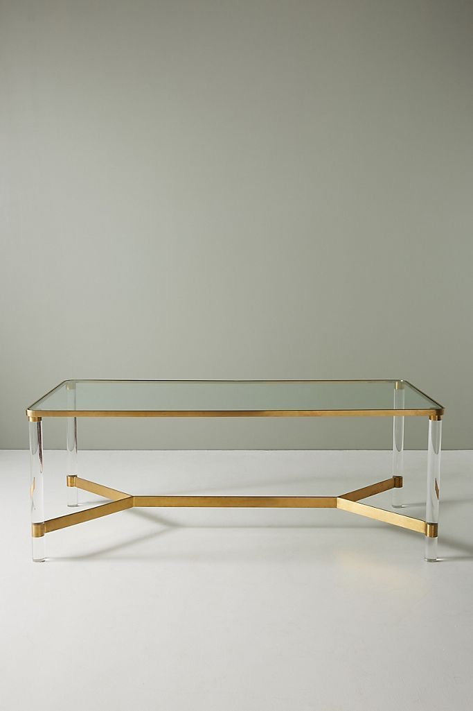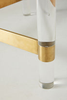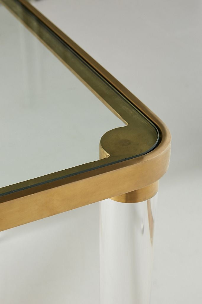 The refractive Lucite legs and gleaming cast brass base of this table are meant to catch the light, drawing all eyes to its Deco-inspired lines.