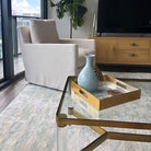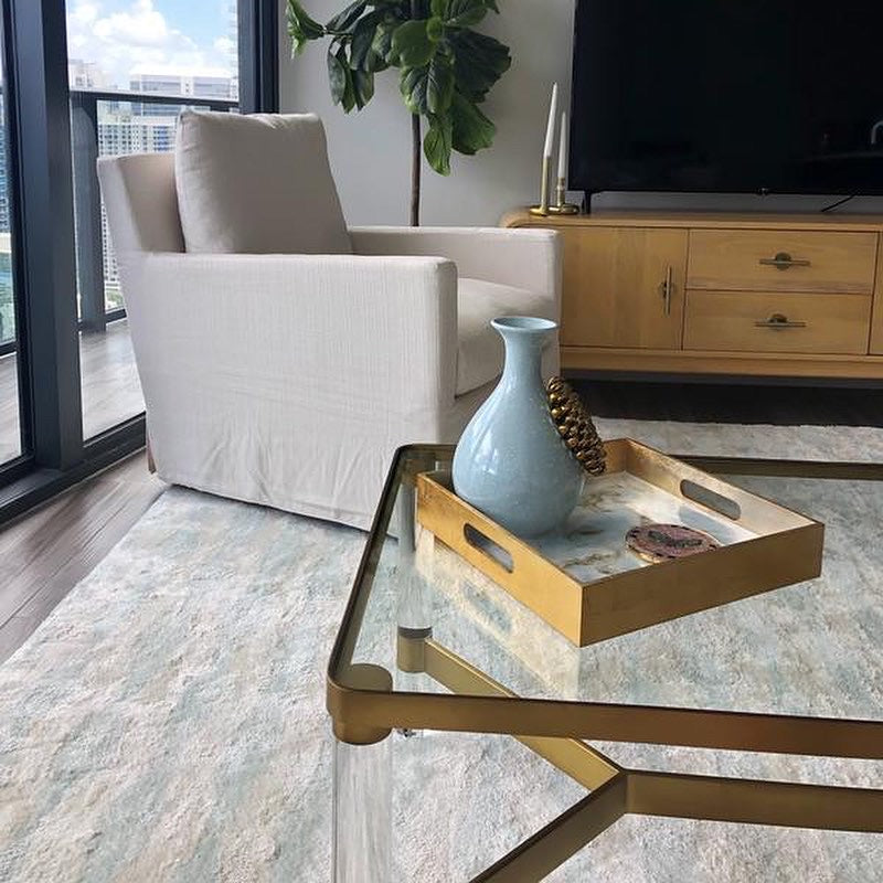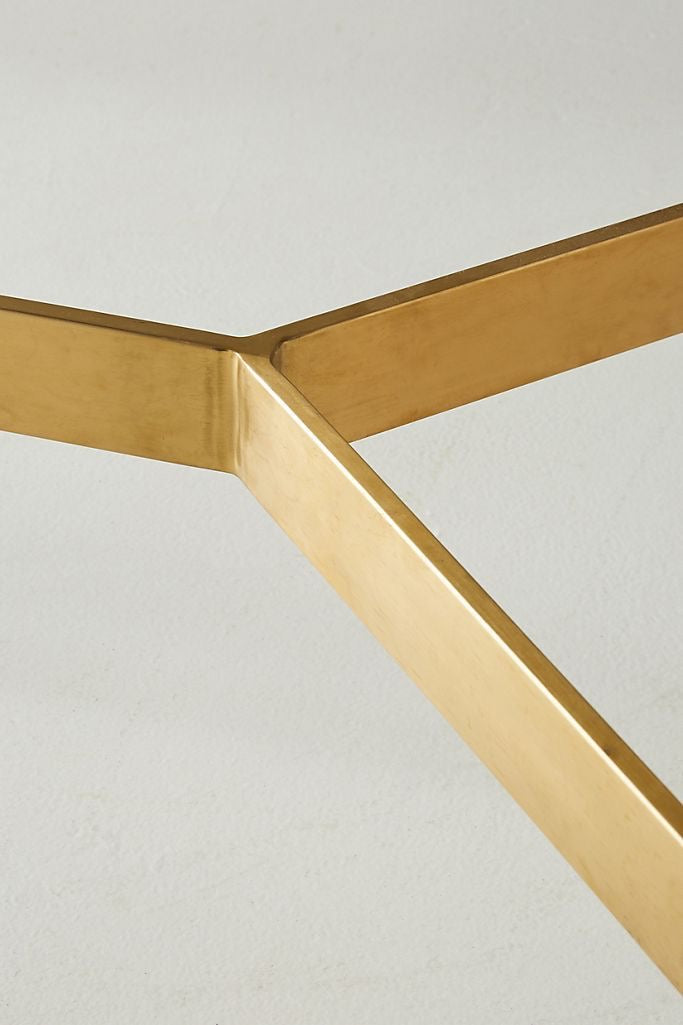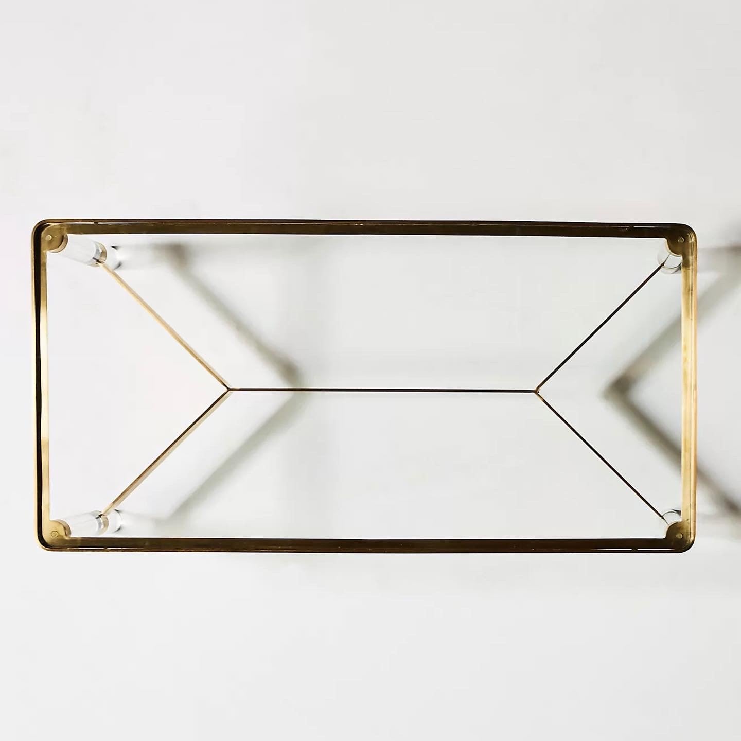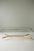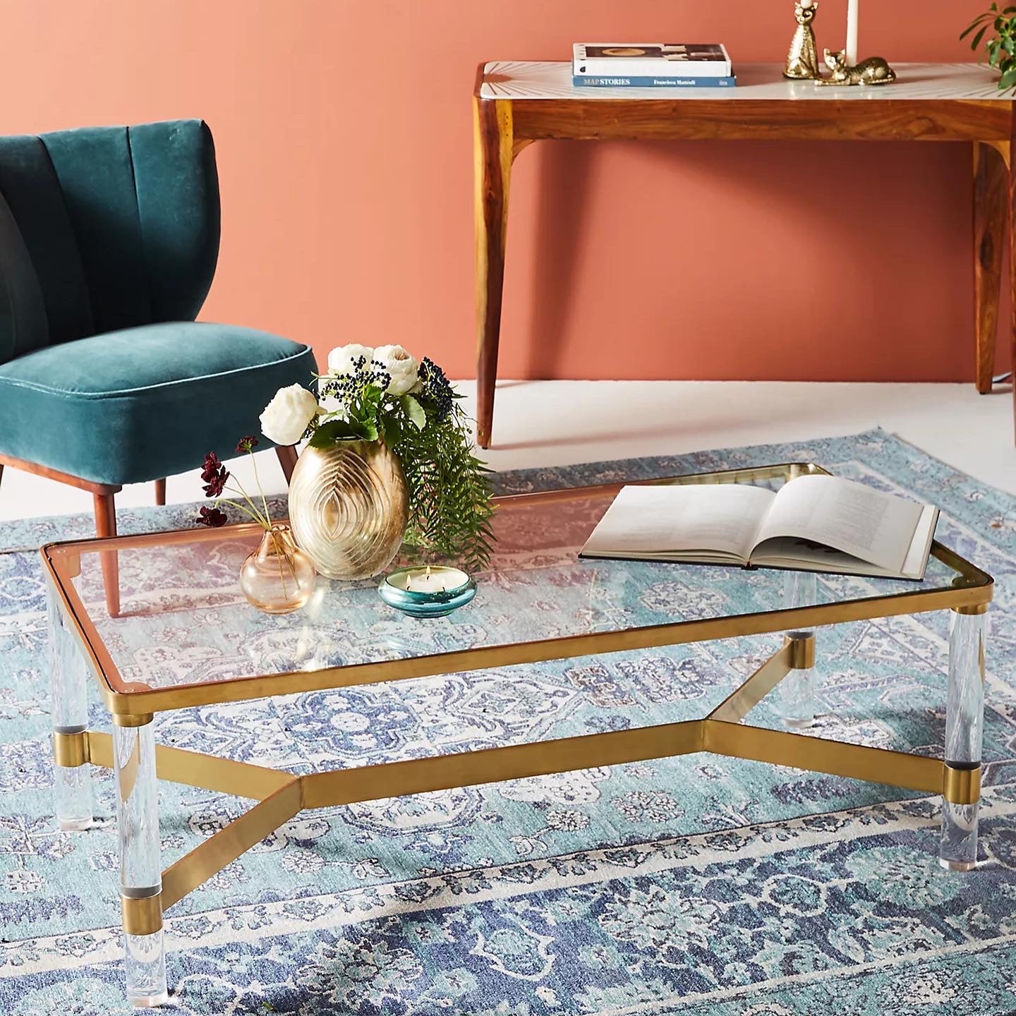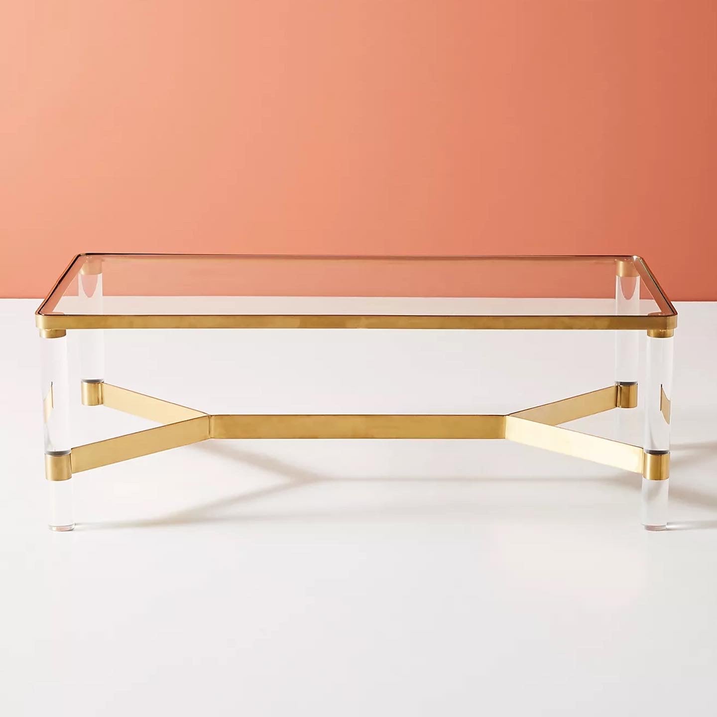 The refractive Lucite legs and gleaming cast brass base of this table are meant to catch the light, drawing all eyes to its Deco-inspired lines.