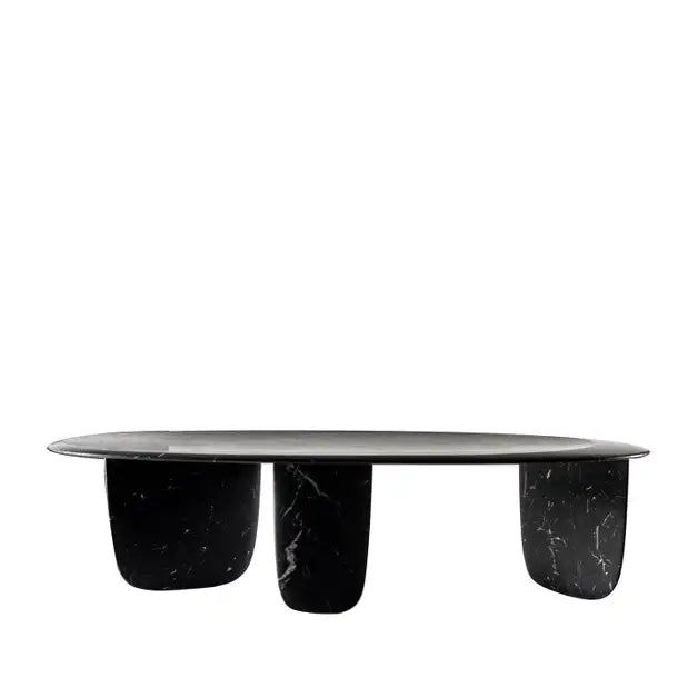 This sculptural coffee table is defined by its flowing, curved forms inspired by nature and ancient architecture. Its stacked stone composition recalls smooth pebbles shaped by seawater, balanced harmoniously to create a striking yet serene presence.