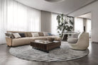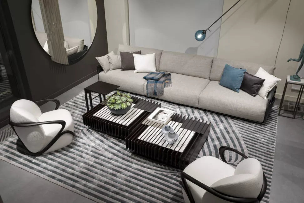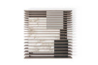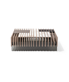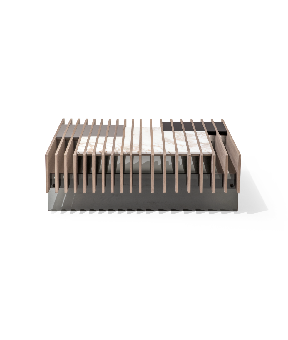 Slats presents regular repeating strips in walnut canaletto wood. An optical effect reminiscent of 1960s graphics thanks to marble, leather or metal inserts. Square low table and rectangular low table-bench in walnut canaletto wood with inserts in different materials; the base is in grey crystal glass.