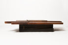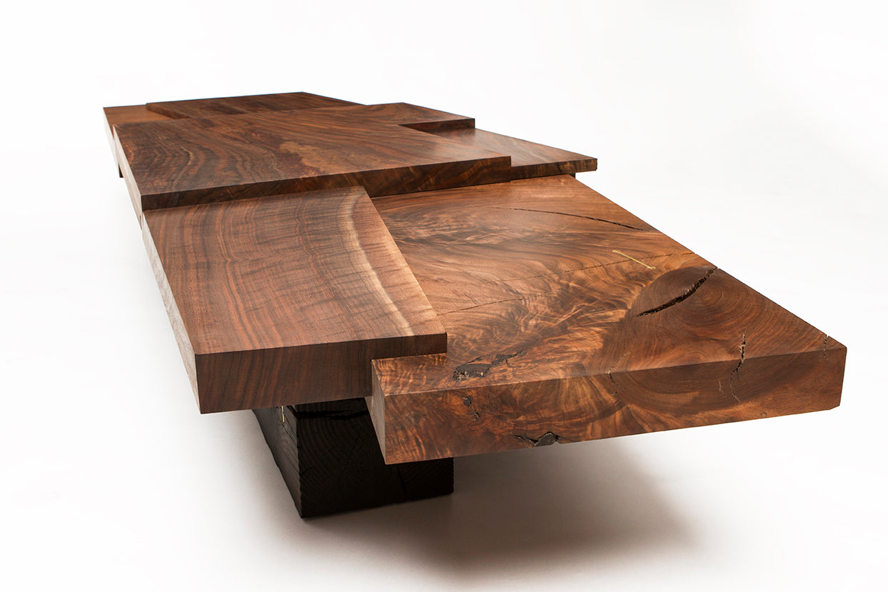 RECLAIMED LIVE EDGE CLARO WALNUT SLABS / RECLAIMED CHARRED DOUGLAS FIR RAILROAD STATION BEAMS / POLISHED BRASS CORSETS / NATURAL OIL + WAX FINISH
