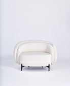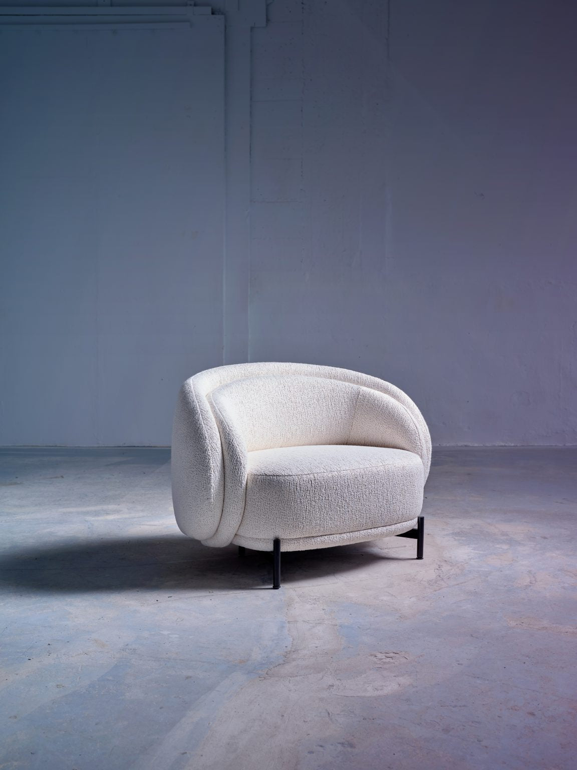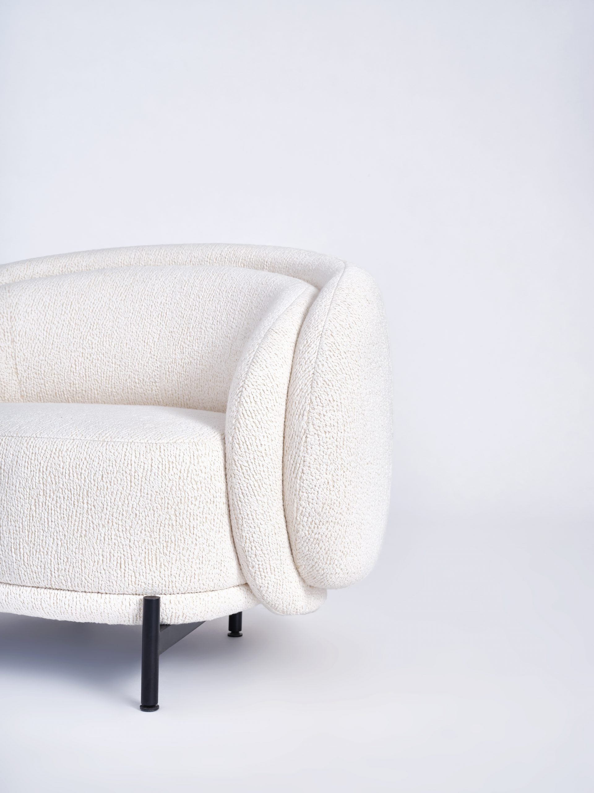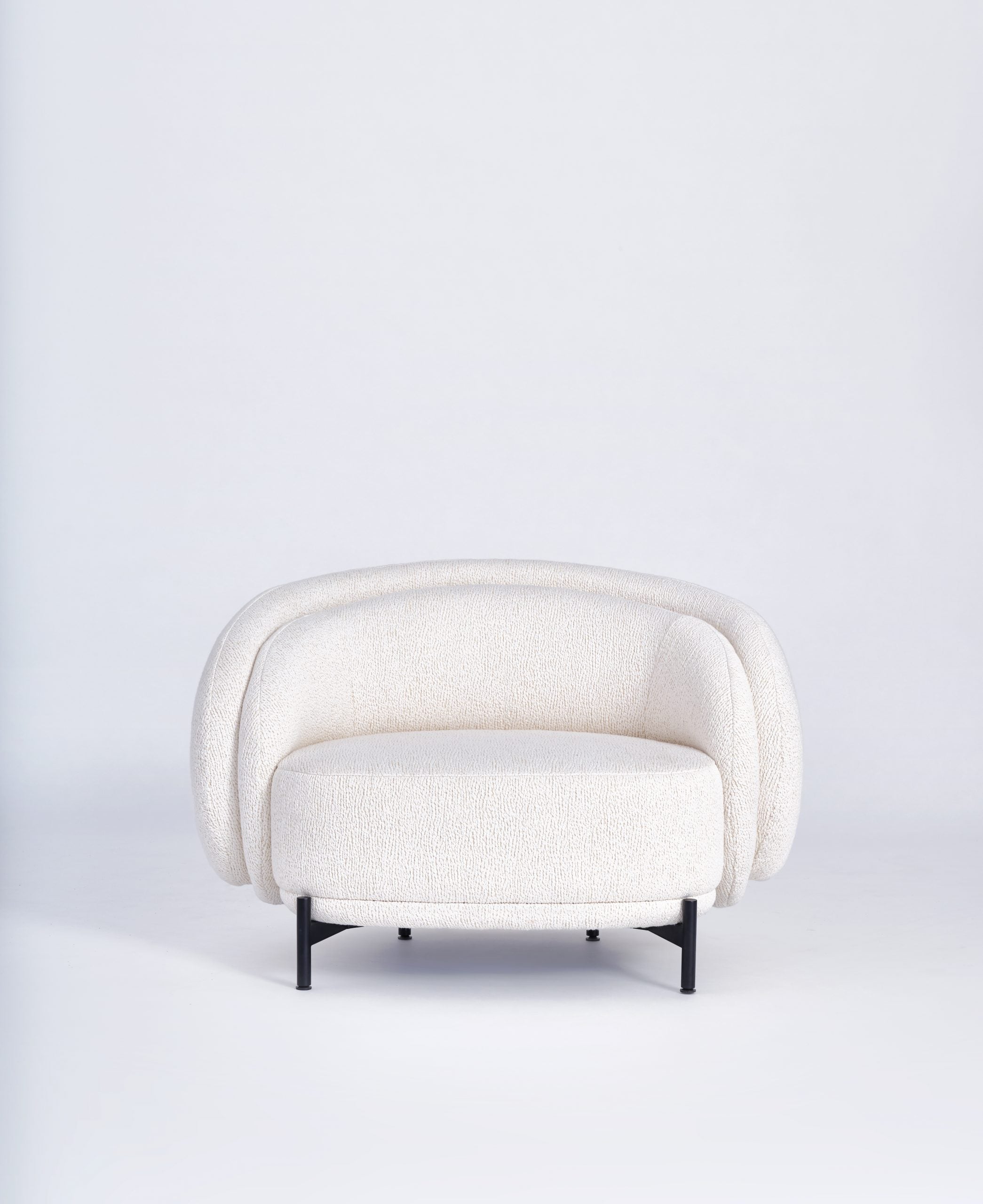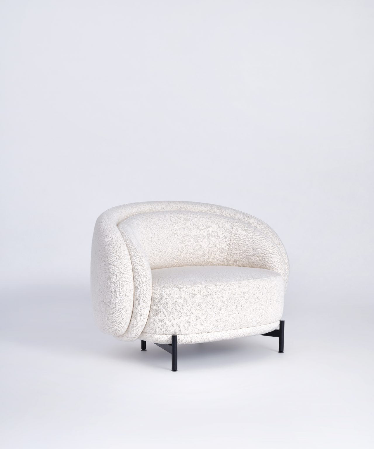 A sculptural low back lounge chair, shown here in a handmade textile inspired by the tradition of Japanese garment making. Outer back is shown in handmade woven textile and inner back shown in a wool upholstery with a Matte Black Metal base.